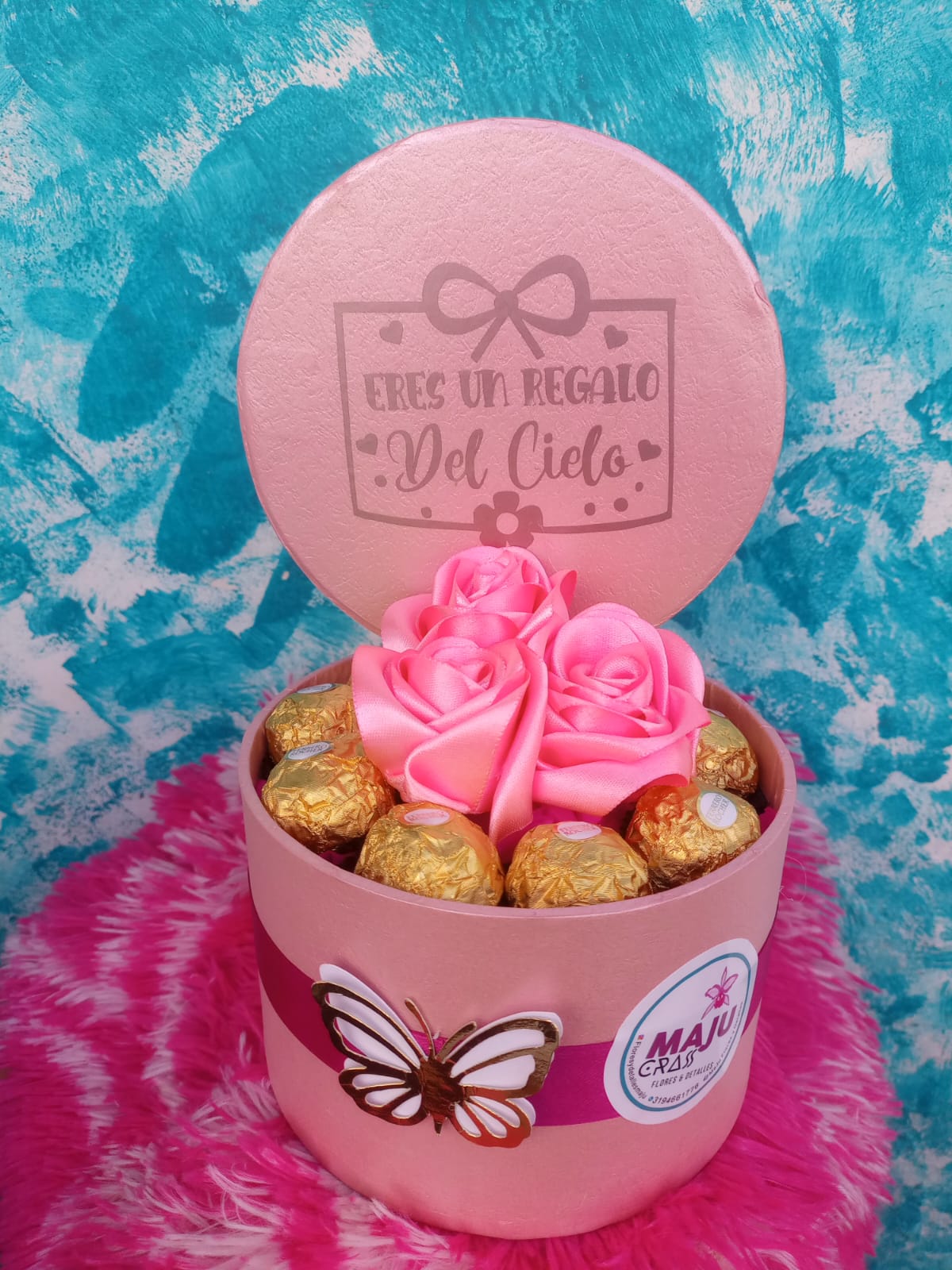 Encantadora caja redonda rosa con el mensaje 'Eres un Regalo del Cielo', adornada con rosas de seda y deliciosos bombones Ferrero Rocher x 10. El regalo perfecto para expresar amor y aprecio.