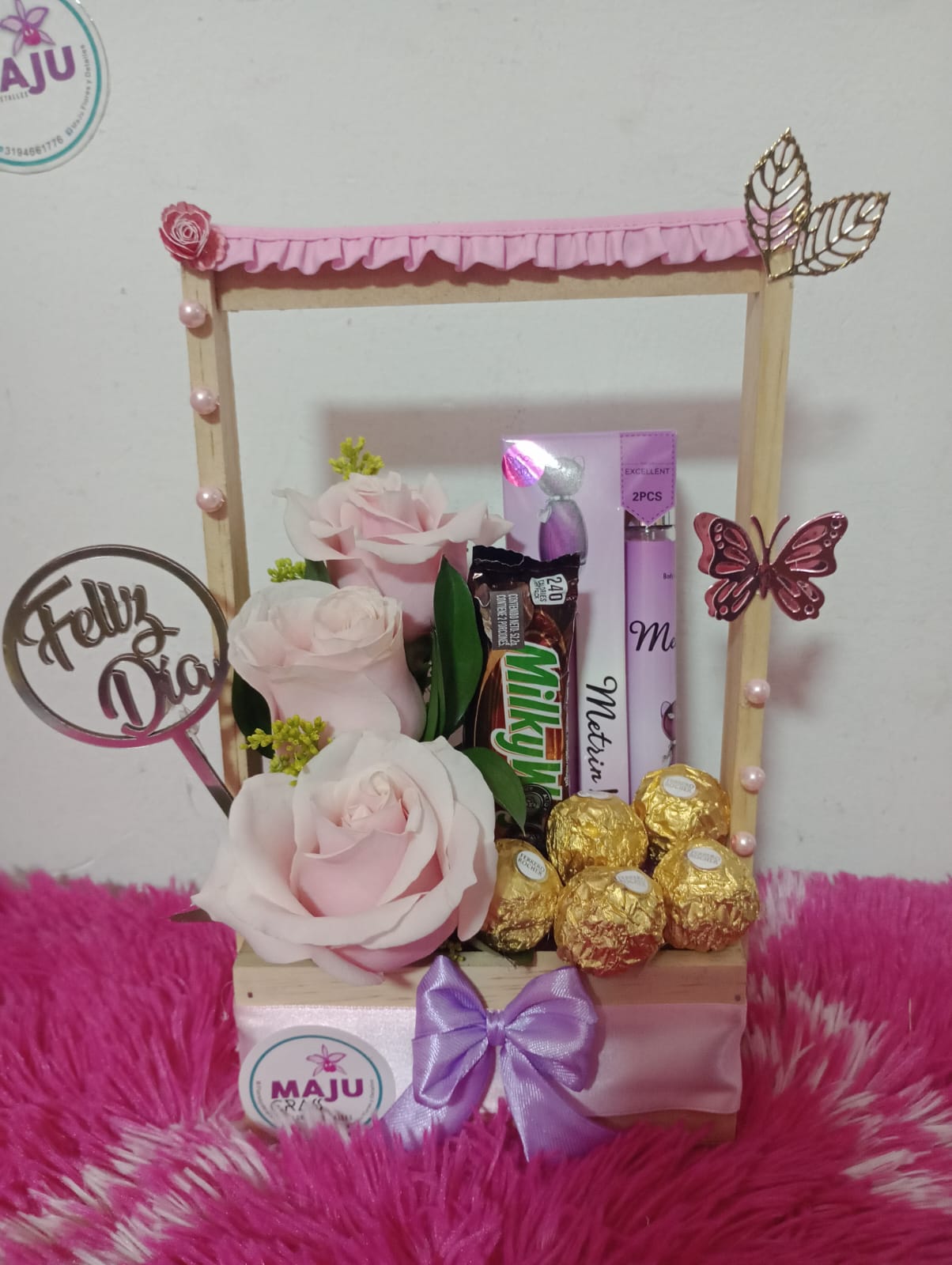 Encantador set de regalo "Feliz Día" con rosas naturales, chocolates Ferrero Rocher y MilkyWay, y un kit de perfume . Presentado en una base de madera elegante, ideal para sorprender en cualquier ocasión especial.
