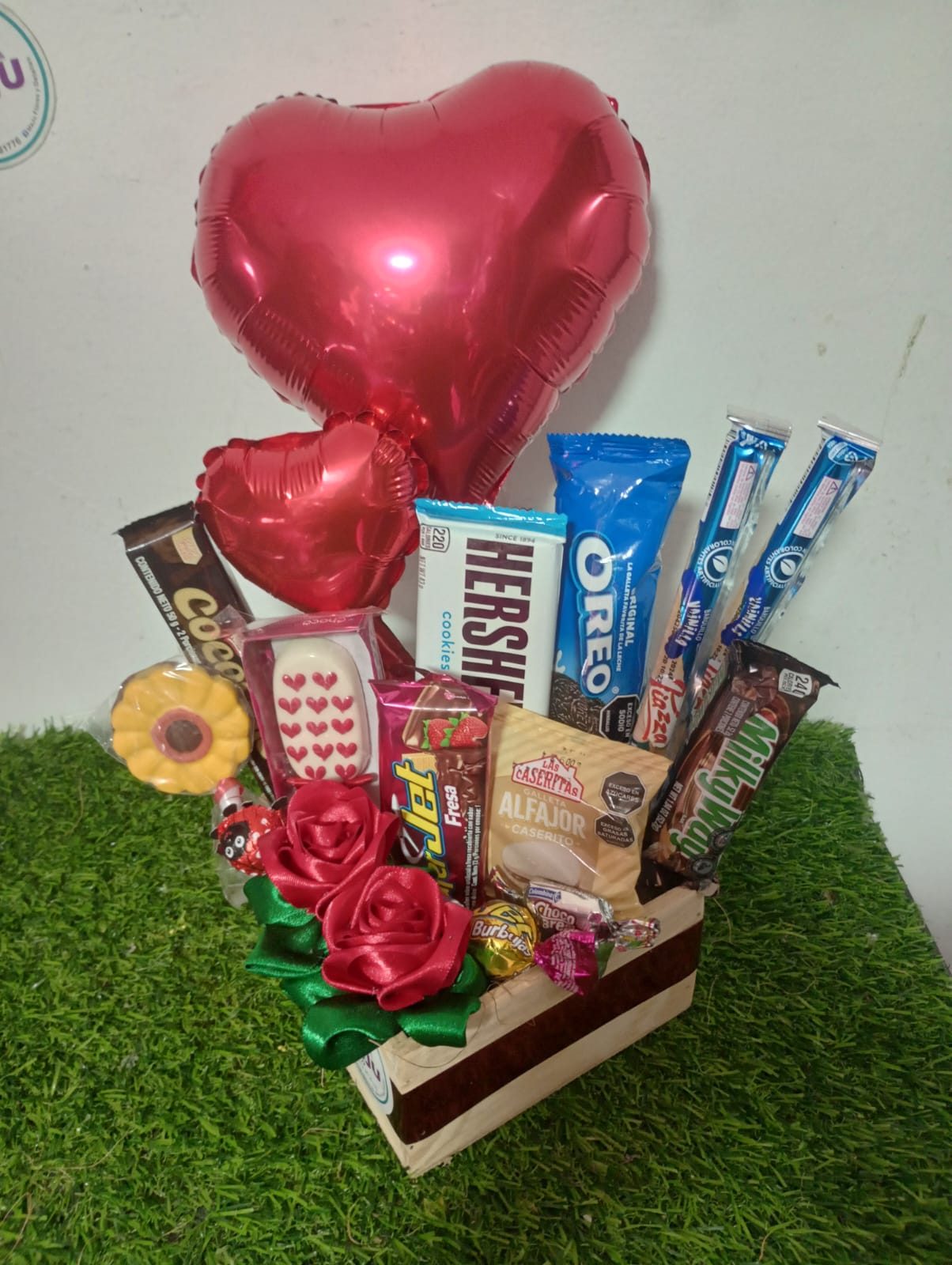 Caja de regalo especial para San Valentín o cualquier ocasión romántica, llena de una deliciosa selección de chocolates, galletas y dulces, decorada con globos de corazón y rosas.