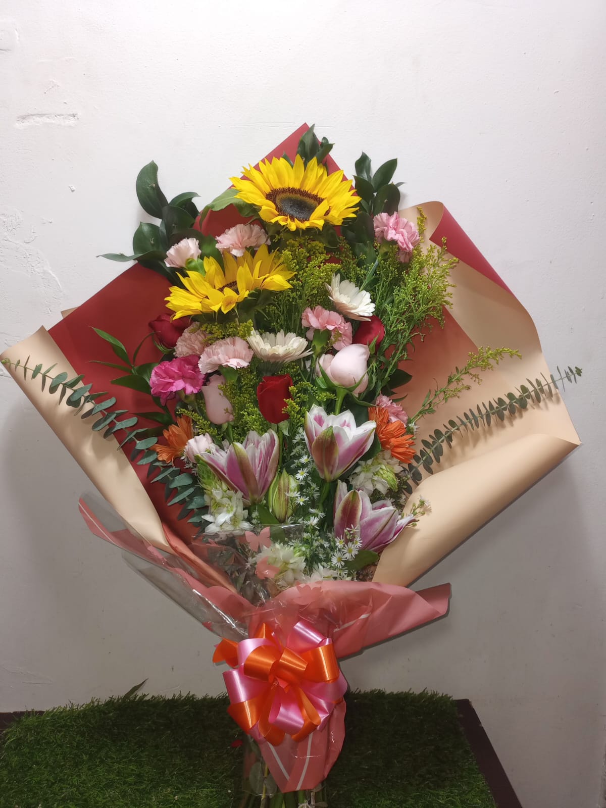 Espectacular ramo mixto con girasoles radiantes, lirios exóticos, rosas delicadas y claveles vibrantes, envuelto elegantemente con un lazo decorativo con follaje exótico. Ideal para celebrar momentos especiales.