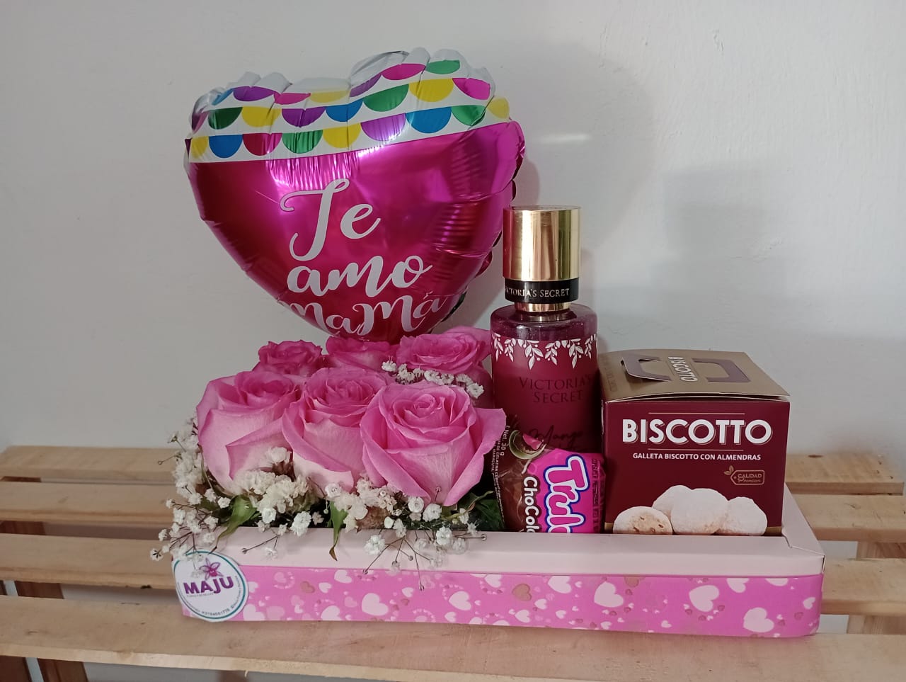 Un detalle encantador para mamá con un globo 'Te amo mamá', rosas frescas, una fragancia Victoria's Secret y deliciosos dulces. Ideal para celebrar su día especial.