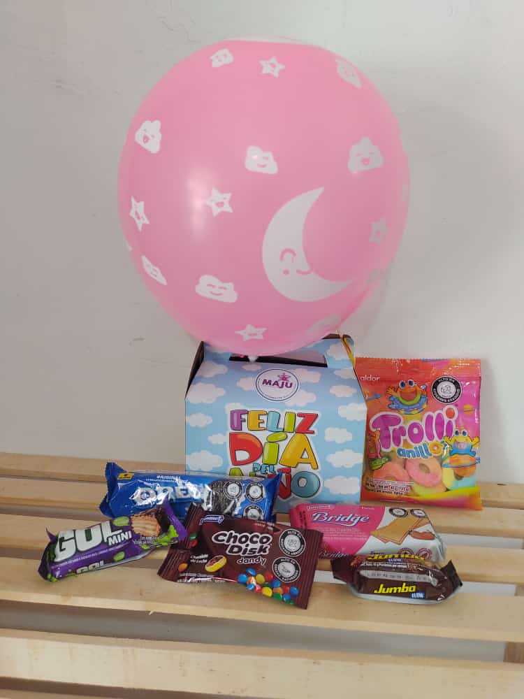 Caja regalo encantadora para celebrar cualquier ocasión, con un globo rosa de luna y estrellas, y una exquisita selección de dulces populares como Oreo, Choco Disk, Bridge, Jumbo y Trolli.