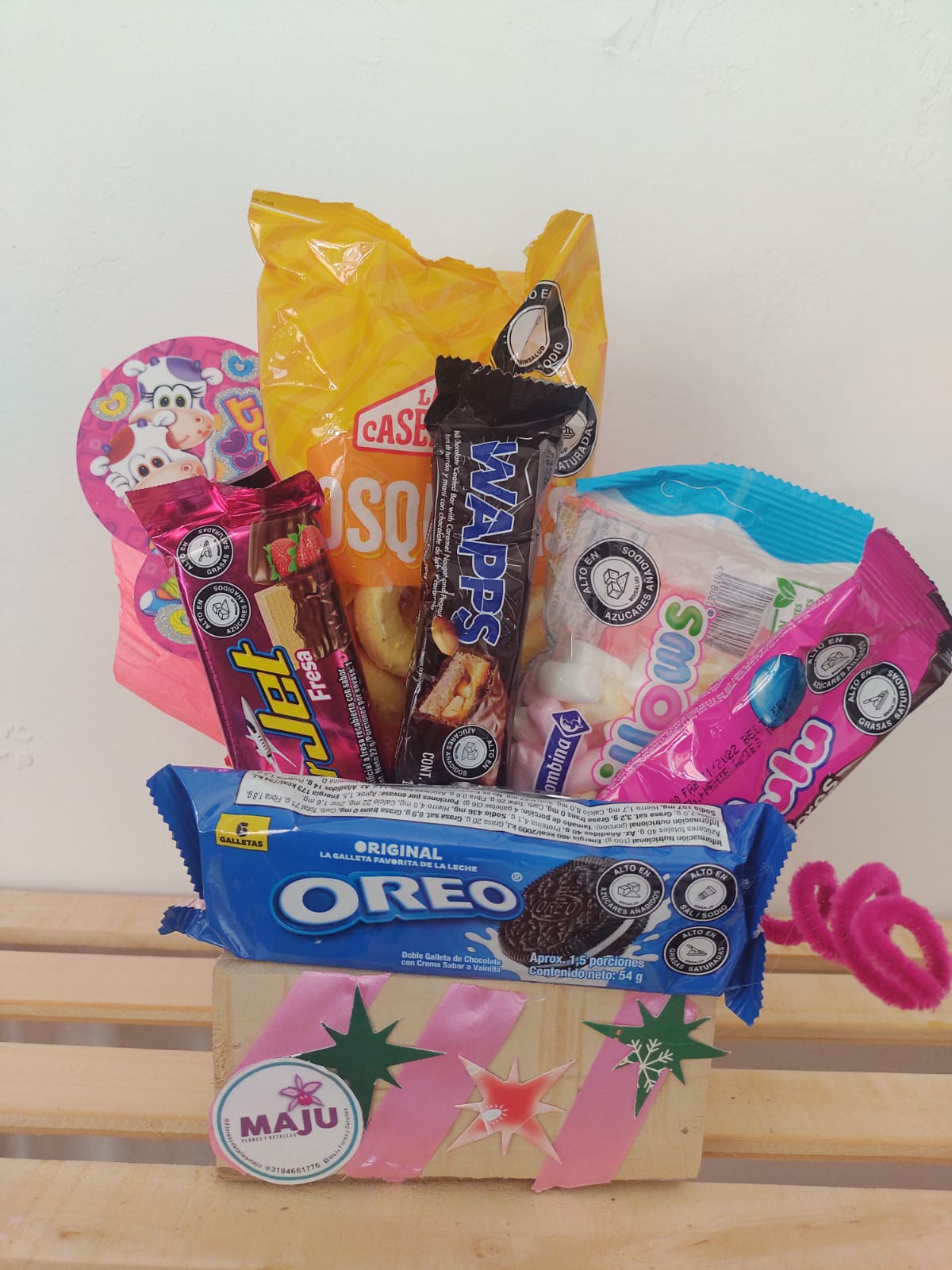 Una deliciosa selección de dulces y snacks populares presentada en una encantadora caja de madera. Perfecta para cualquier ocasión, sorprende con chocolates, galletas, malvaviscos y más.