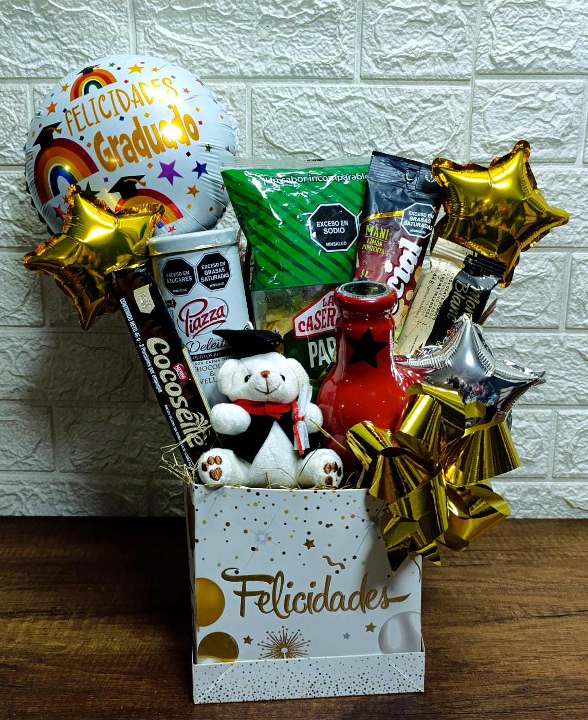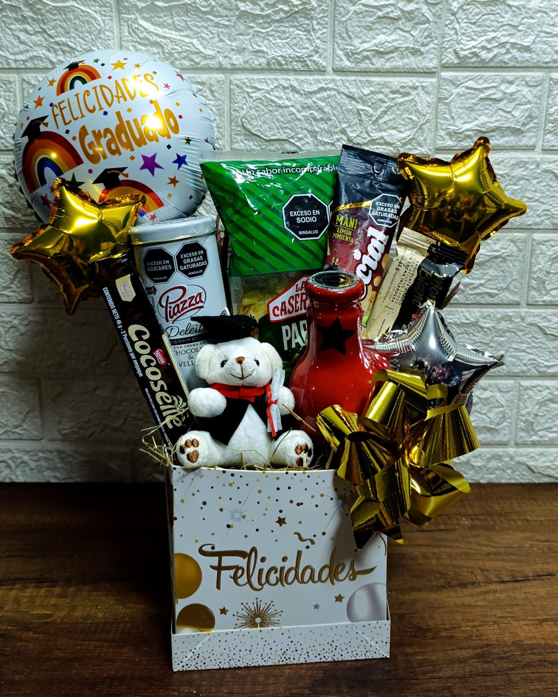 Celebra la graduación con esta caja de regalo premium. Incluye un globo "Felicidades Graduado", un adorable osito graduado, una variedad de deliciosos snacks: te, chocolatina mont blanc, tarro de piazza, galletas cocosette, papas grandes,mani la especial. Tarjeta personalizable