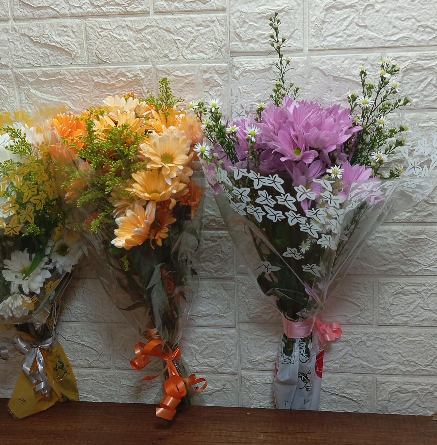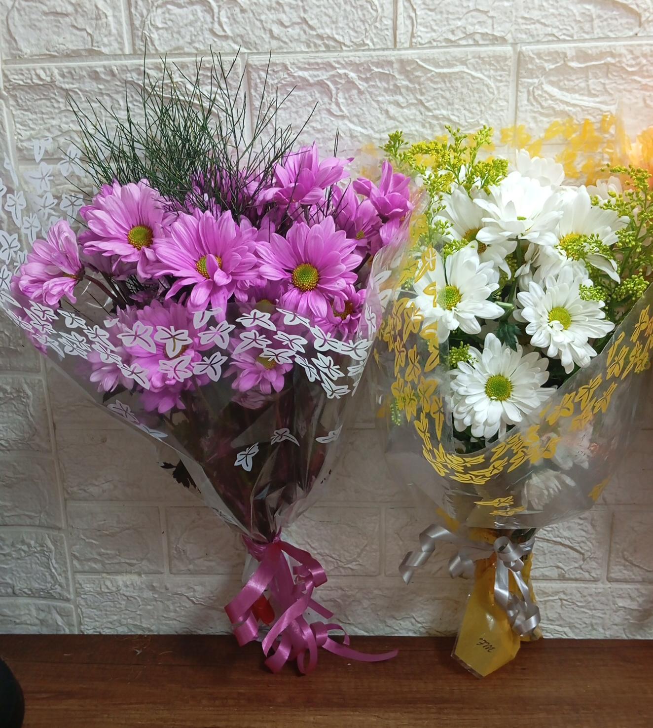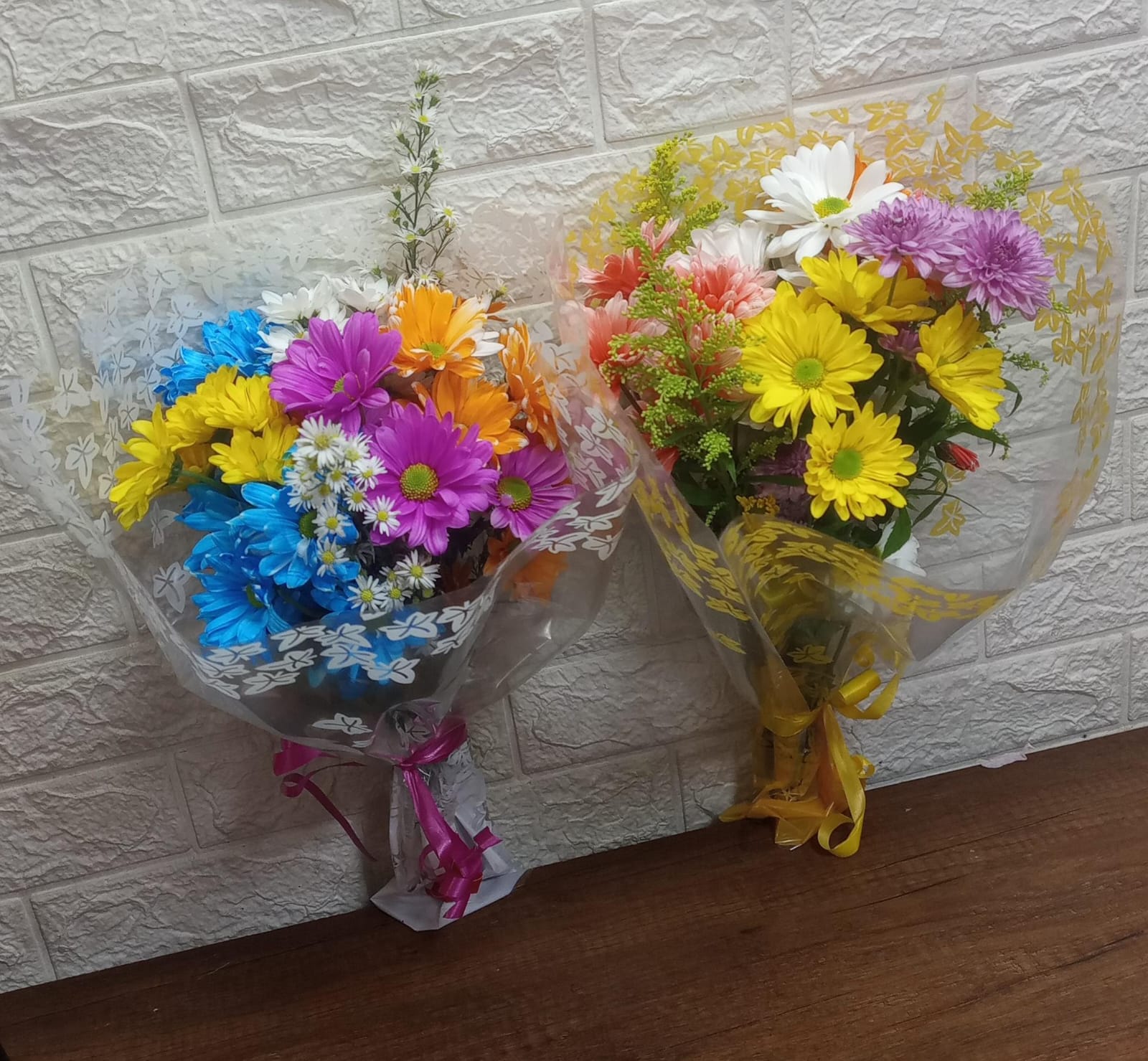 Un ramos de flores, cada uno con una mezcla única de margaritas y otras flores en tonos brillantes como azul, amarillo, morado, naranja y blanco. Hogar