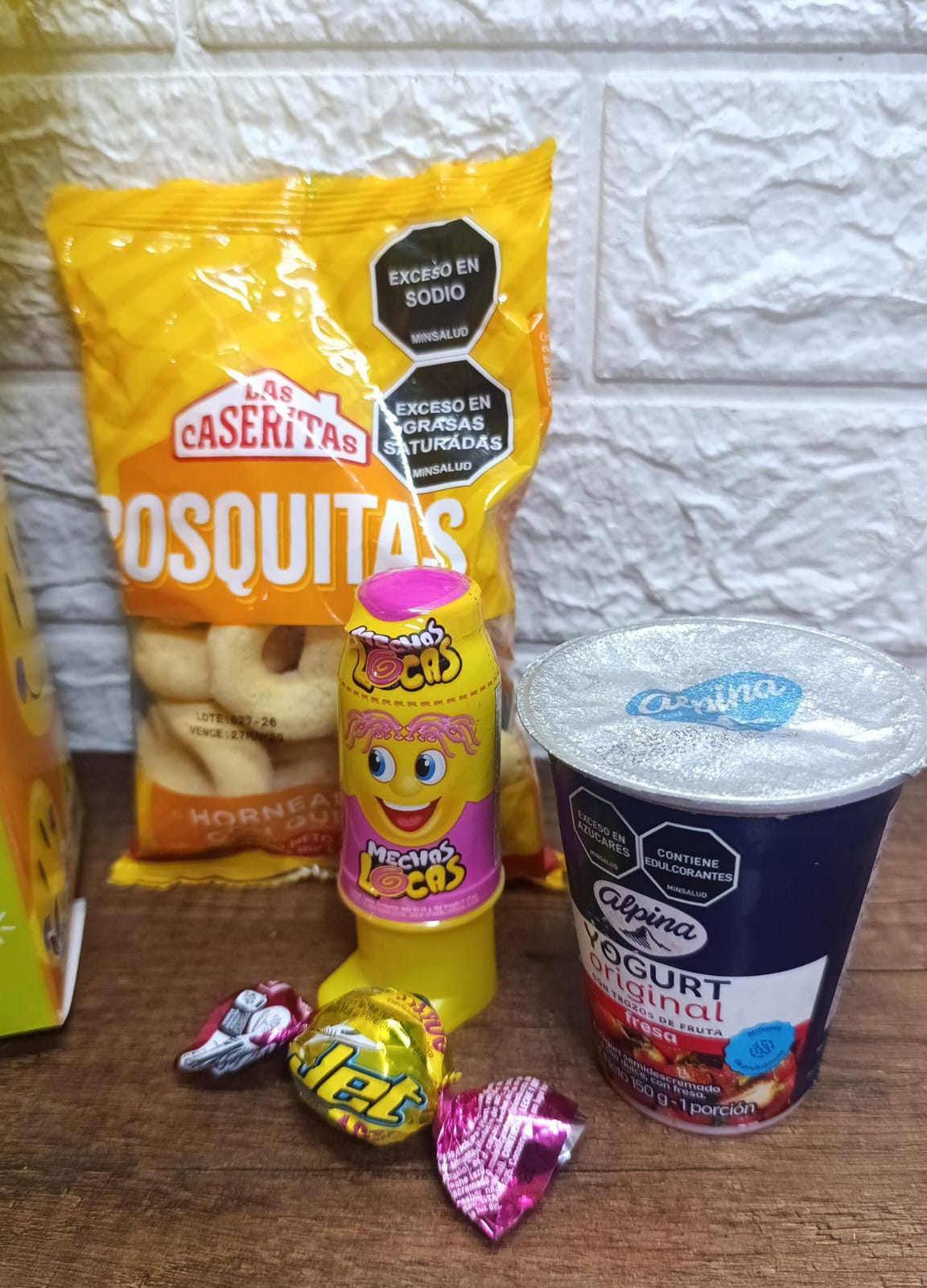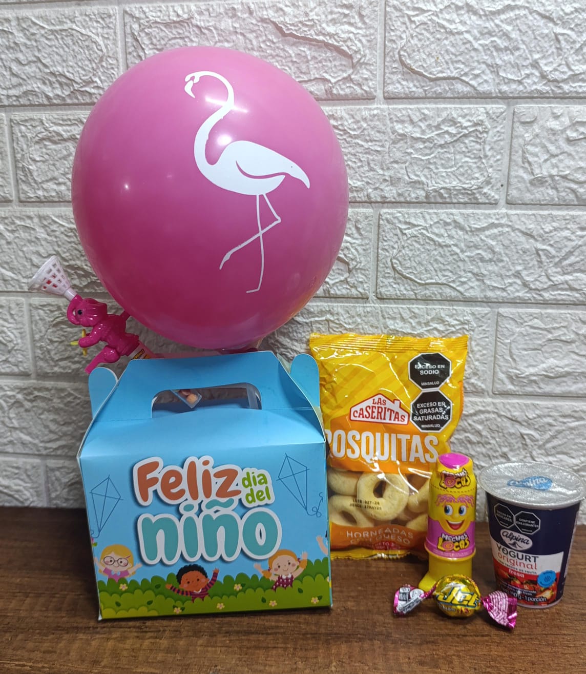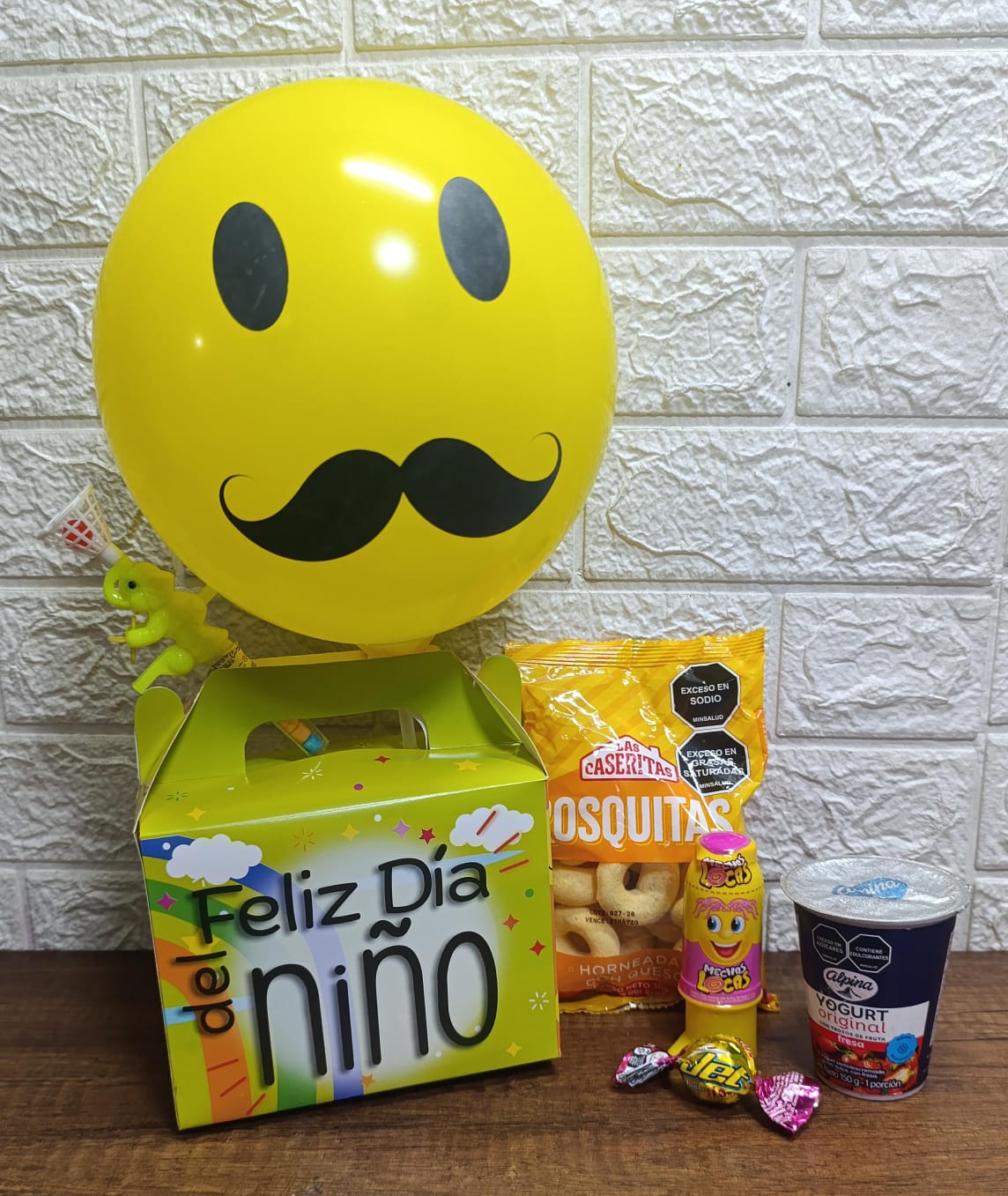Caja de regalo "Feliz Día del Niño" con globo de emoji bigotón variado, snacks rosquitas y yogur chocolate burbuja, tarro animado mechas locas y silvato en forma de elefante con dulces. El kit perfecto para sorprender y celebrar a los pequeños en su día especial.