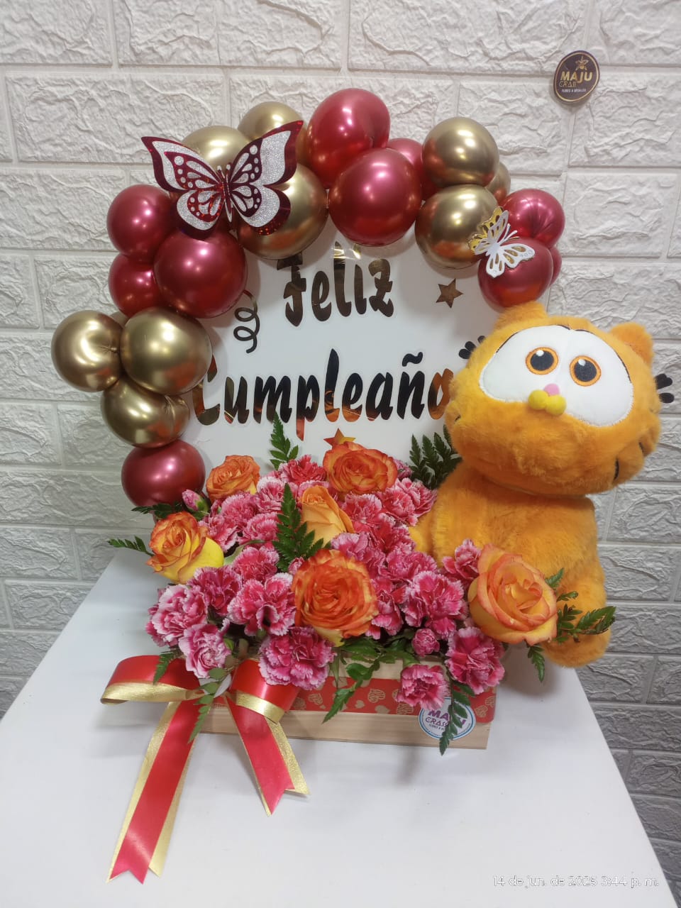 Impresionante arreglo floral para cumpleaños, con arco de globos de Feliz Cumpleaños. Rosas frescas combinadas especialmente con claveles, ´peluche mediano. detalle ideal para cumpleaños o fechas especiales.