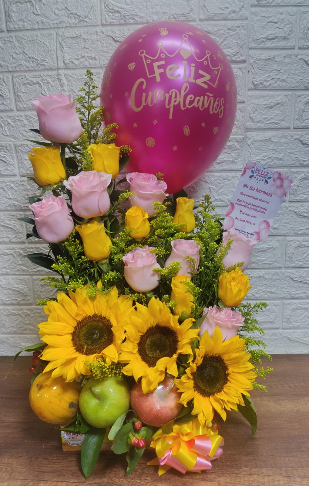 Celebra con este espléndido arreglo floral que combina girasoles vibrantes, rosas amarillas y rosadas, frutas frescas y un globo de "Feliz Cumpleaños" para un toque festivo y único.