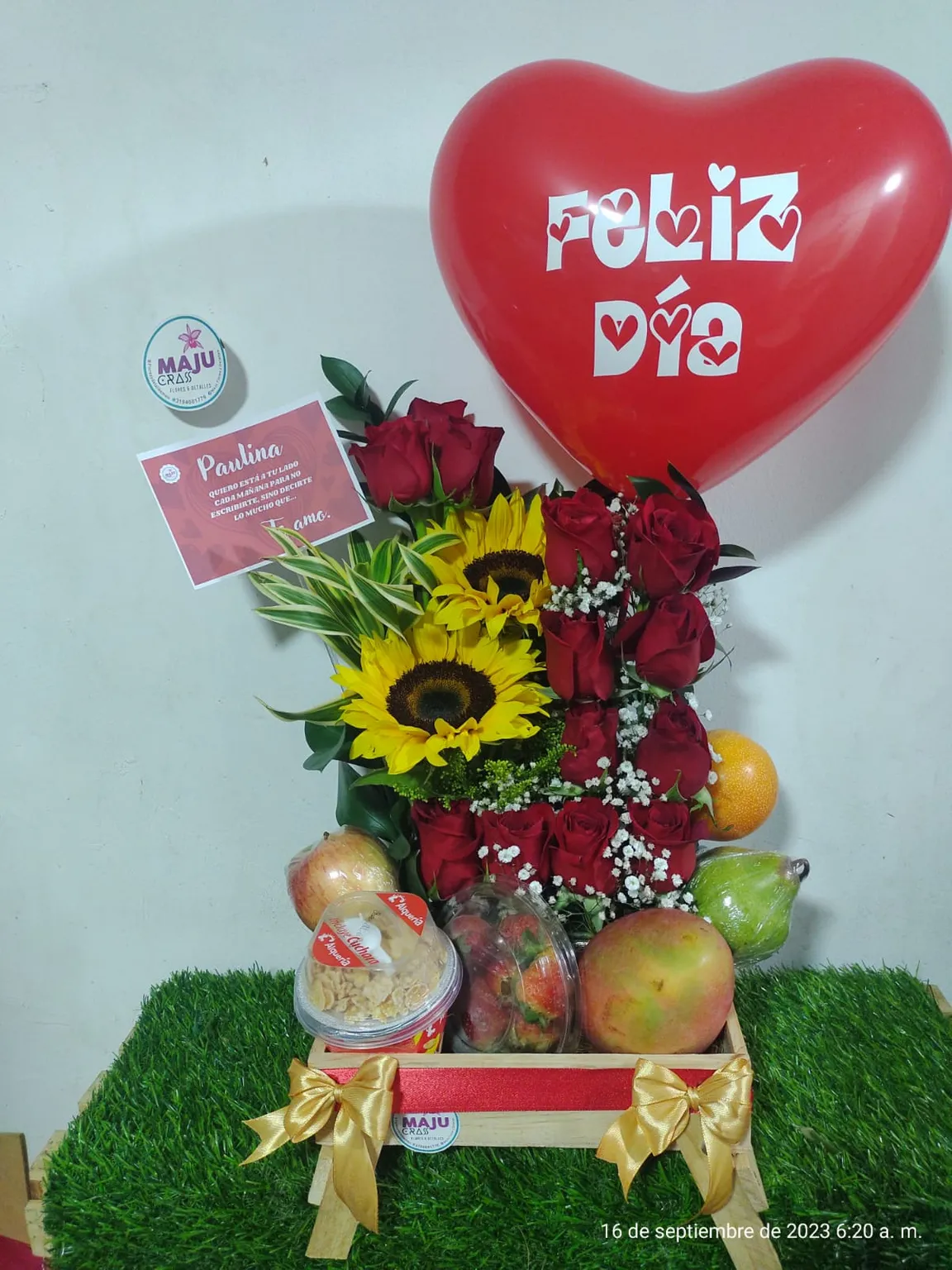 Cesta de regalo 'Te Quiero' con globo de corazón, un vibrante arreglo floral de girasoles y rosas, frutas frescas variadas y dulces. Ideal para expresar amor en cualquier ocasión.
