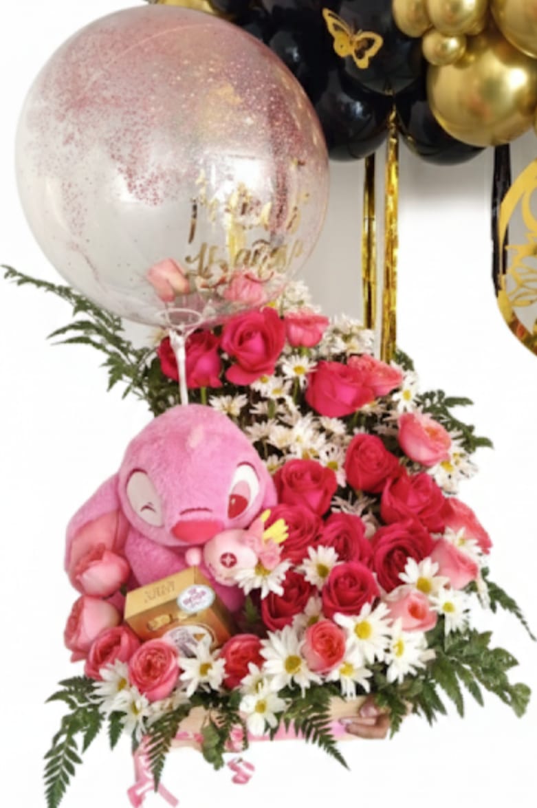 Hermoso arreglo floral para quinceañera con rosas x 25, margaritas, peluche de Ángela, Ferrero Rocher y globo personalizado de "¡Felices 15 años!".
