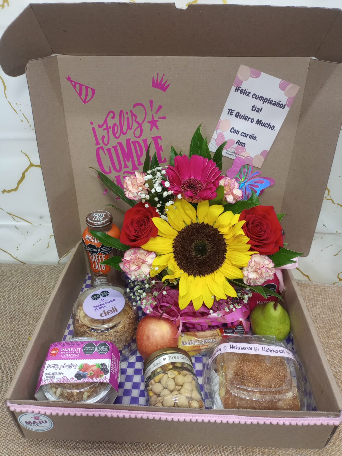 Exclusiva caja de regalo con un vibrante arreglo floral de girasol y rosas, complementado con deliciosos productos gourmet sanduche, torta, maní en frasco, palito de queso 2 frutas frescas y una tarjeta de felicitación personalizada, ideal para celebrar un cumpleaños.