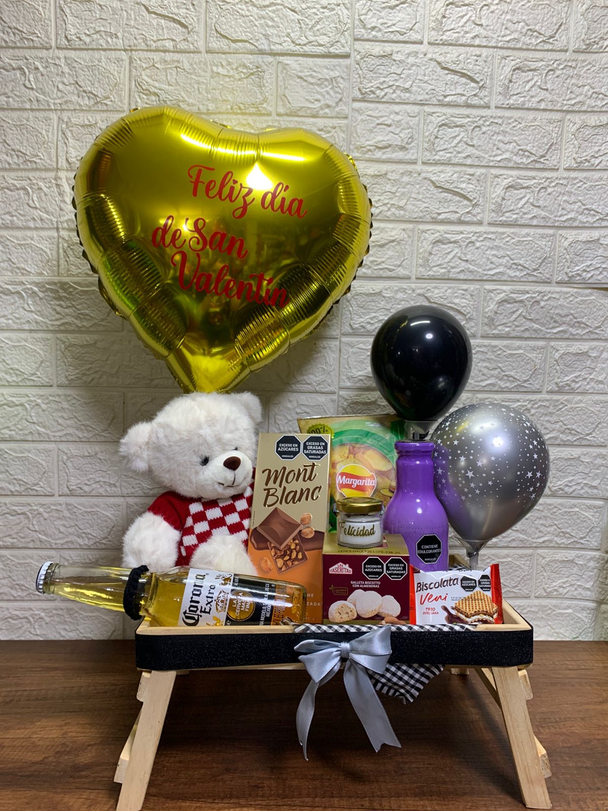 Celebra San Valentín con esta exclusiva cesta de regalo que incluye un adorable osito, cerveza Corona, caja de chocolate americano, snacks papas, galletas de avellana y de almendras, te hatsu, velita aromatizada y globos festivos. Ideal para sorprender a tu ser querido con un detalle inolvidable.