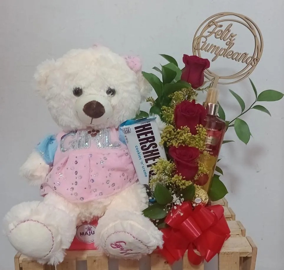 Set de regalo encantador con peluche suave mediano (Varia según disponibilidad), arreglo floral de rosas rojas, chocolates Hershey's y Ferrero Rocher, y fragancia. Incluye topper con mensaje según celebración