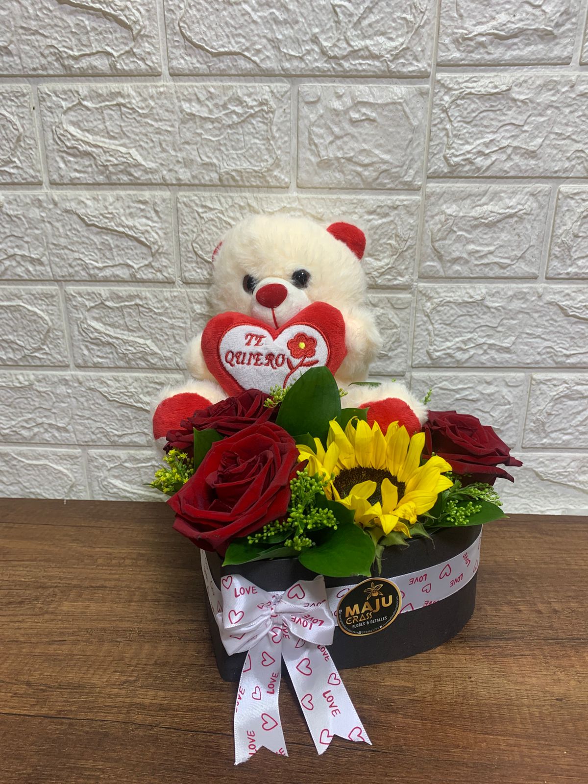 Un encantador arreglo floral que combina la dulzura de un osito de peluche rosas rojas pasión y un vibrante girasol. Ideal para expresar amor y cariño en cualquier ocasión especial.