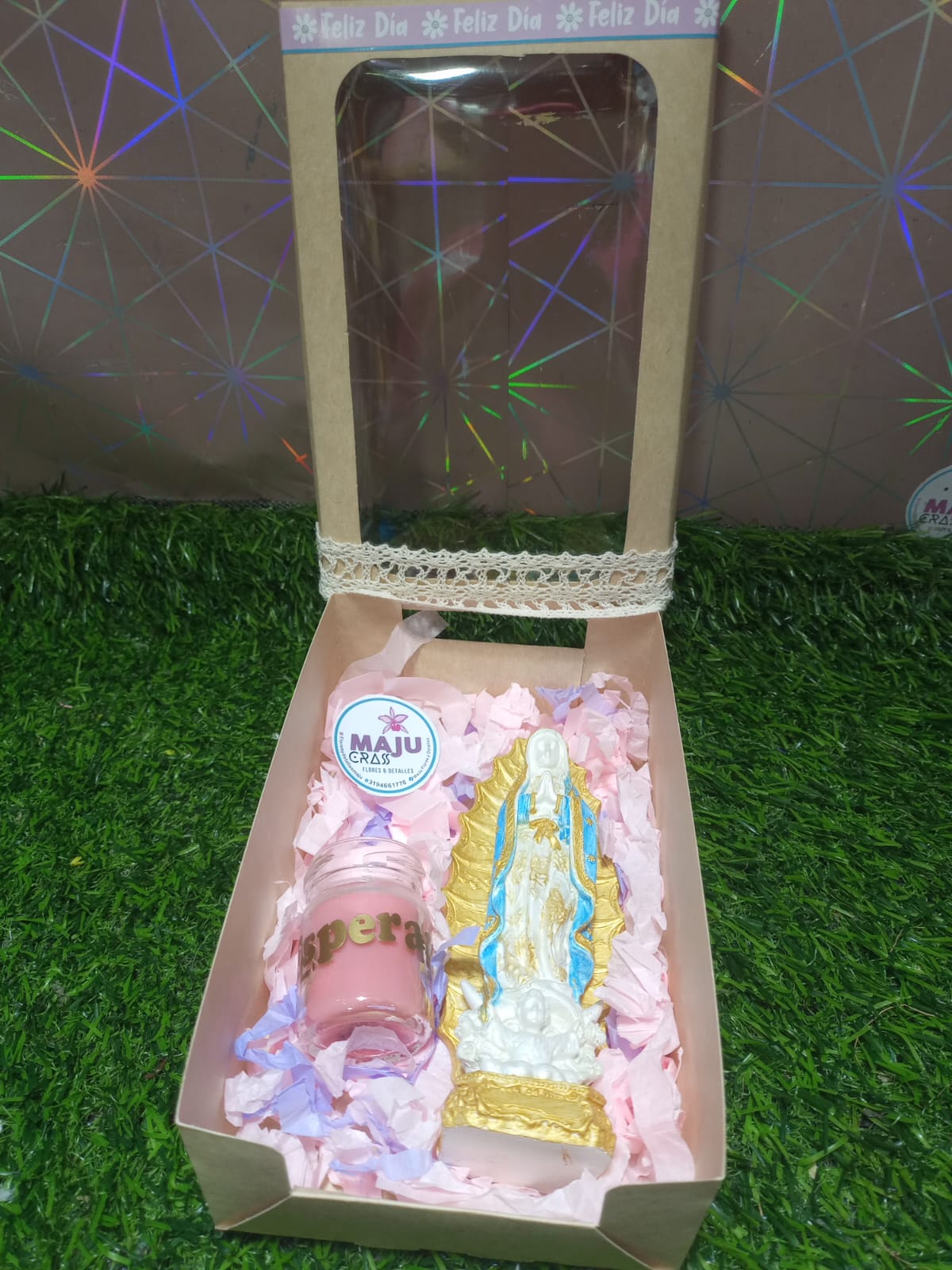 Un hermoso set de regalo que incluye una detallada figura de la Virgen de Guadalupe y una veladora con el mensaje, ideal para brindar paz y esperanza en cualquier hogar.