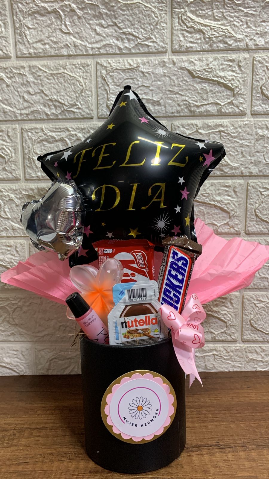 Encantador regalo con chocolates variados, mini Nutella, brillo labial, pinza para el cabello en forma de flor y globos de "Feliz Día", ideal para sorprender a una princesa en cualquier ocasión especial.