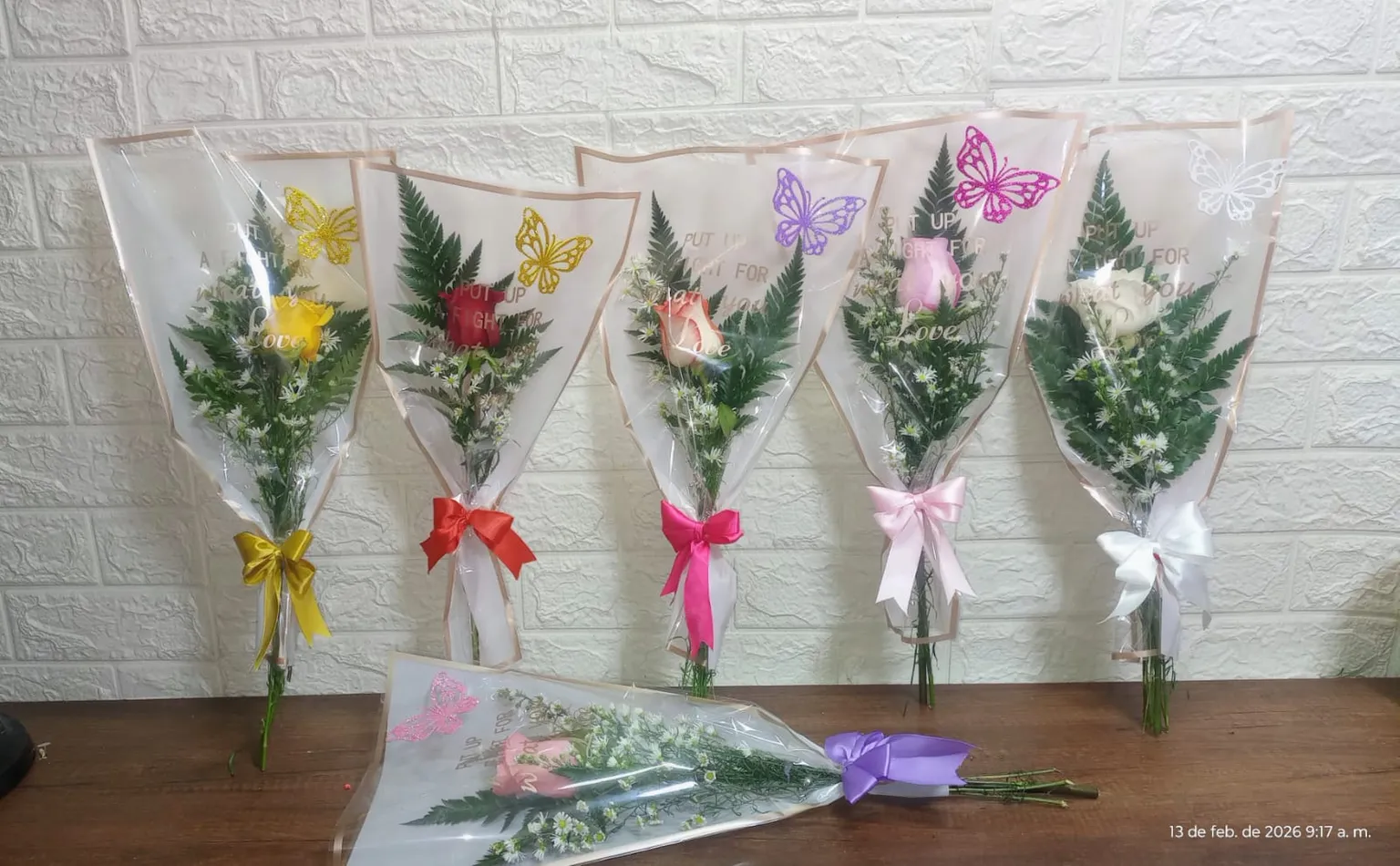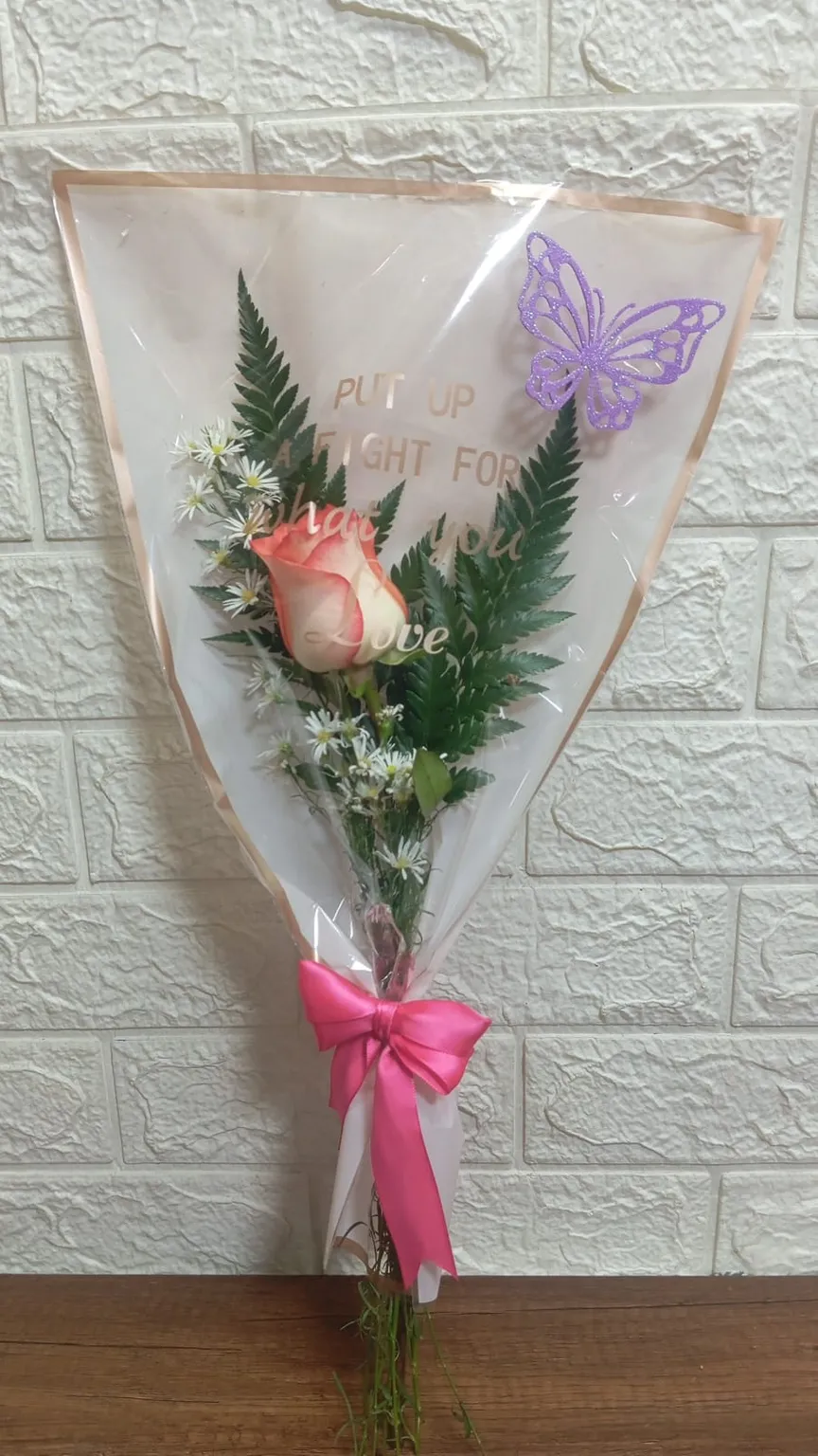 Elegante ramo de una rosa con follaje, flores blancas y una mariposa lila brillante. Envuelto en papel delicado con un lazo rosa vibrante, ideal para cualquier ocasión especial y para expresar amor.