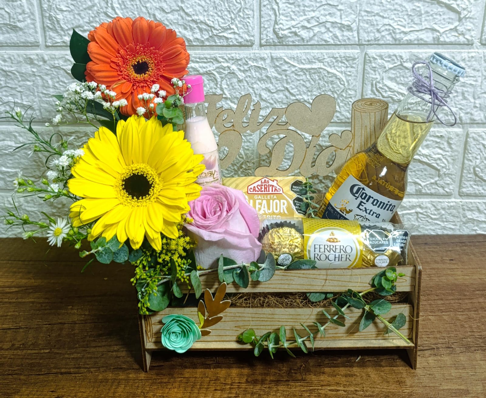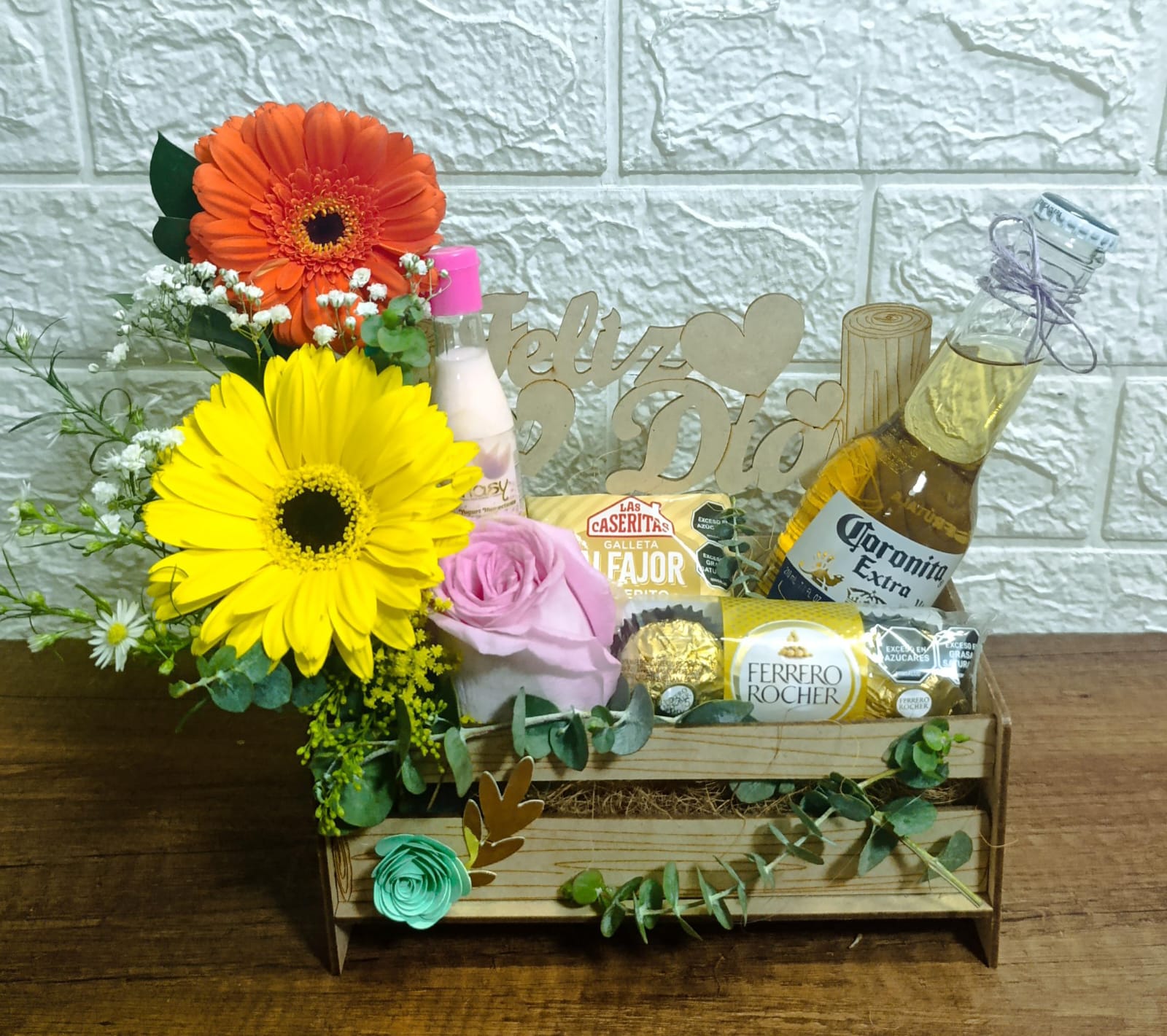 Sorprende con nuestra hermosa cesta de regalo, combinando la frescura de gerberas y rosas con delicias gourmet como alfajores, chocolates Ferrero Rocher y una Coronita. Ideal para celebrar. Detalle una crema de manos viajera