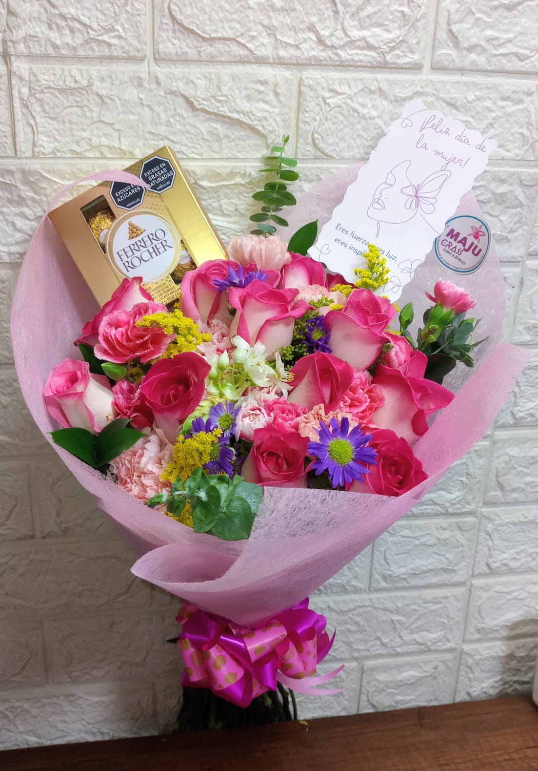 Elegante ramo de rosas rosadas 12 y claveles, acompañado de chocolates Ferrero Rocher. Perfecto para celebrar el Día de la Mujer o cualquier ocasión especial. Incluye una tarjeta con mensaje inspirador.
