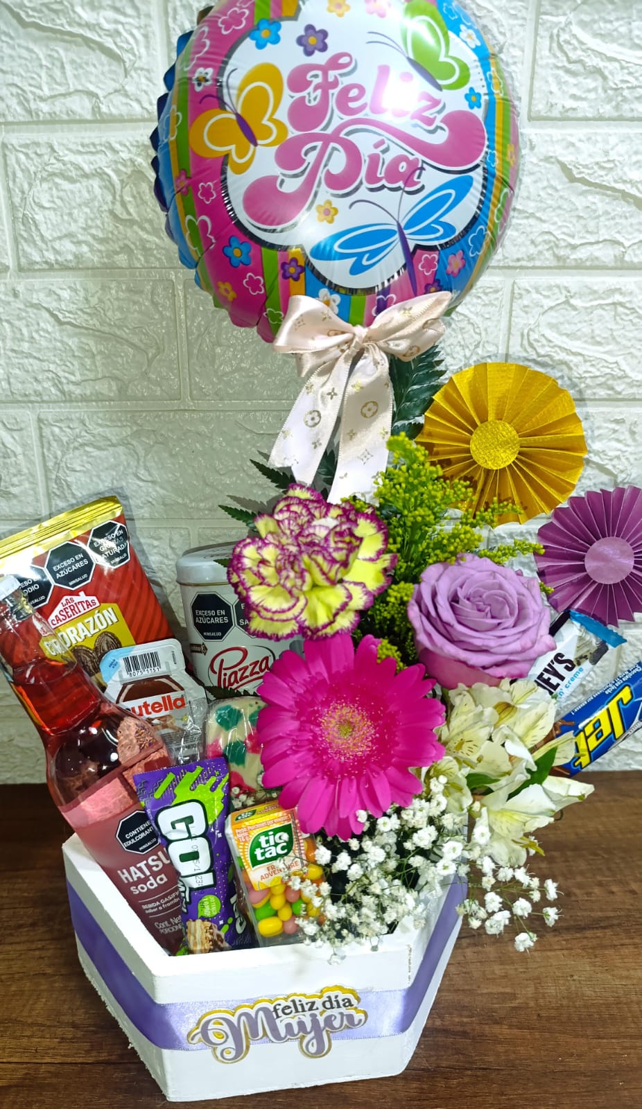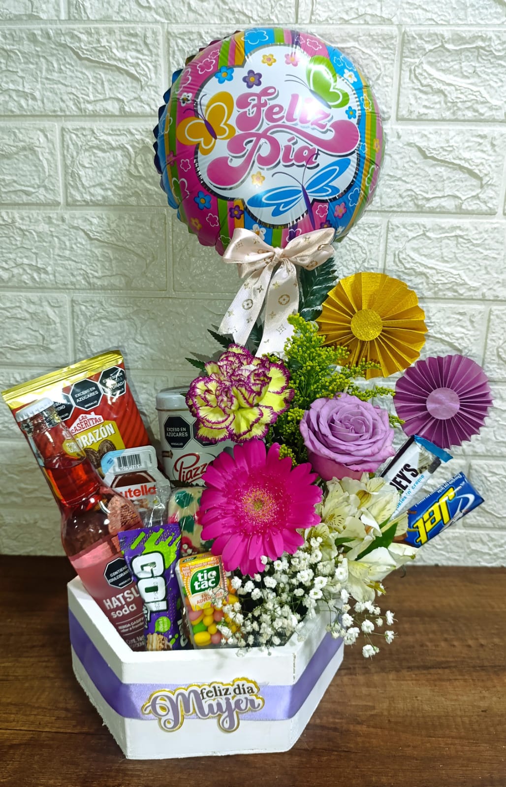 Encantador arreglo floral con rosas, gerberas y claveles, acompañado de una variada selección de dulces, snacks, bebida y globo "Feliz Día", ideal para celebrar a la mujer en cualquier ocasión especial. Nutella, chocolates hershey, JET, hojaldre Corazón, Tic Tac y GOLL!. Tarro de barquillos Soda hatsu Paleta de chocolate figuras