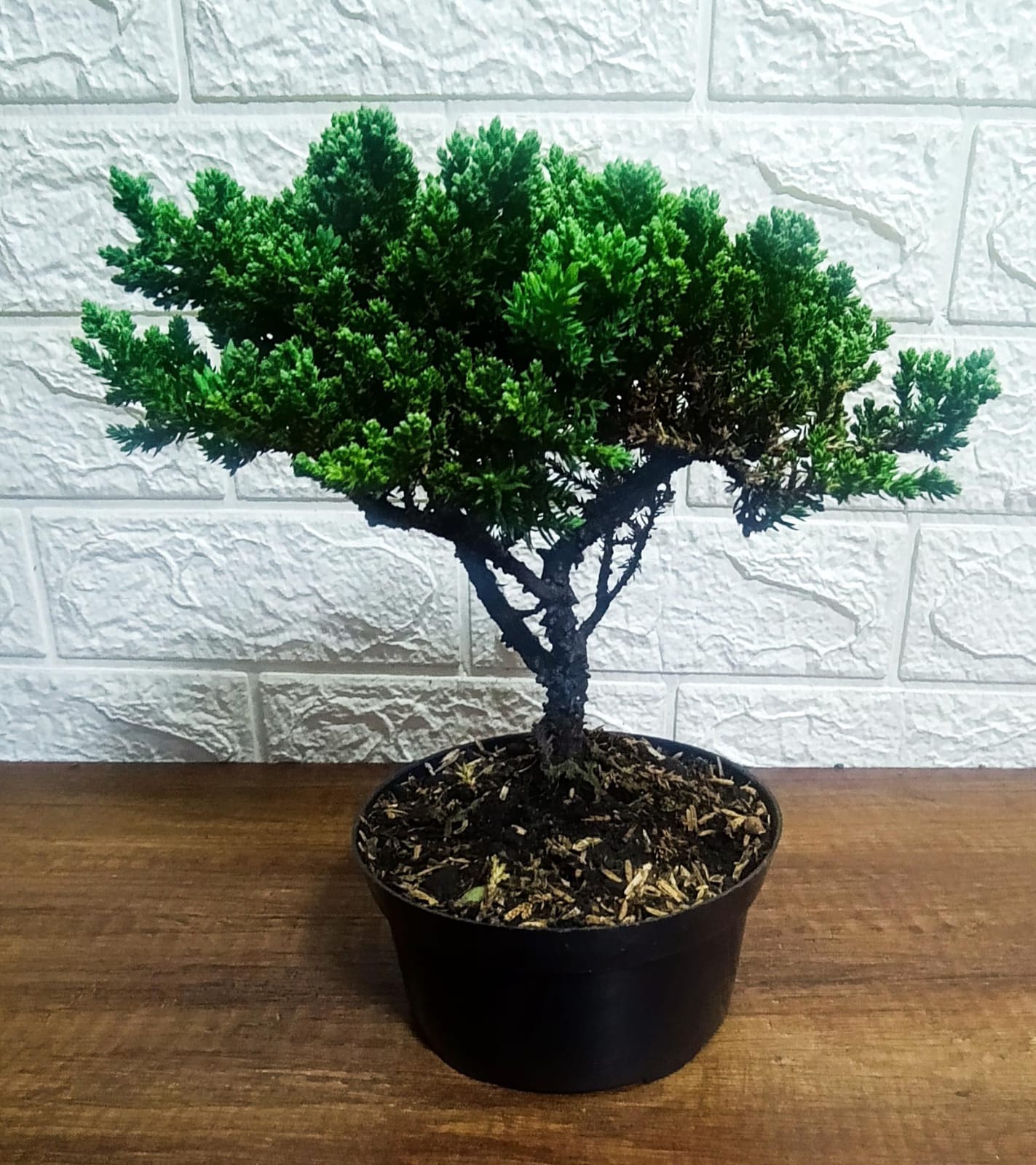 Elegante bonsái de Juniperus en maceta negra, ideal para decorar cualquier espacio. Aporta un toque natural y sofisticado con fácil mantenimiento.