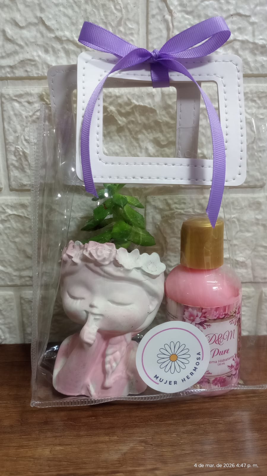 Hermoso set de regalo para mujer, incluye una crema hidratante D&M Pure, una maceta decorativa con diseño femenino y una suculenta natural, presentado en una bolsa transparente con lazo morado.
