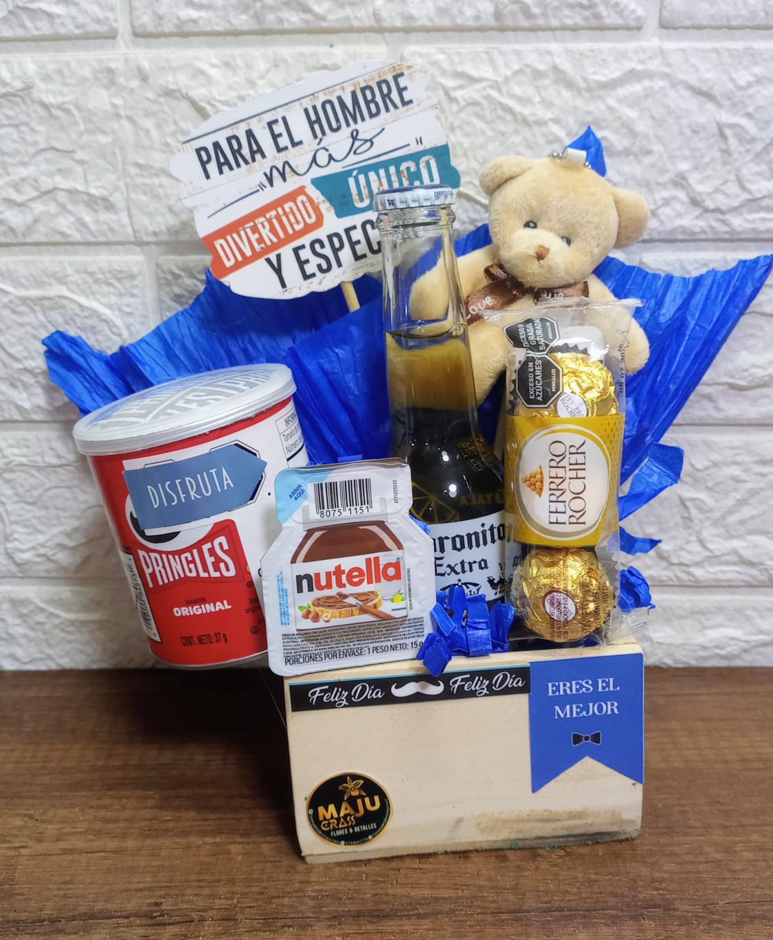 Caja de regalo variada con dulces, snacks y una bebida, perfecta para celebrar a ese hombre especial en su día. Incluye Pringles, Nutella, Ferrero Rocher, una bebida tipo Coronita y un peluche.