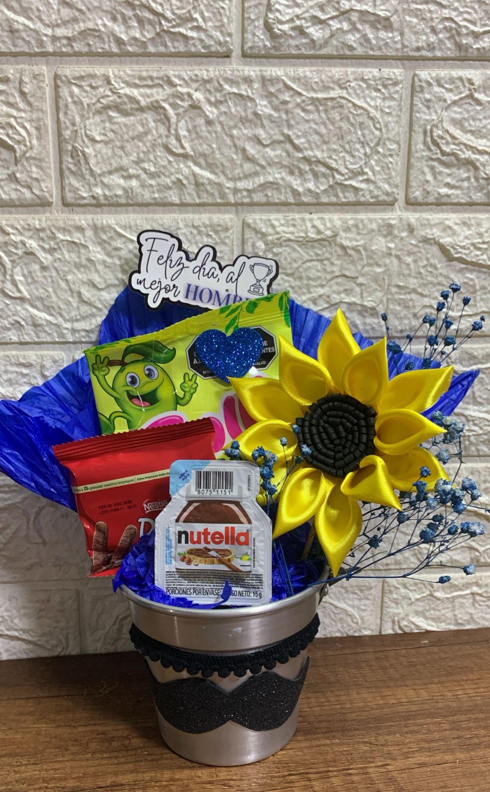 Canasta de regalo ideal para celebrar a "el mejor hombre", con una selección de dulces y chocolates, presentada en un balde decorado con un girasol y un mensaje especial.