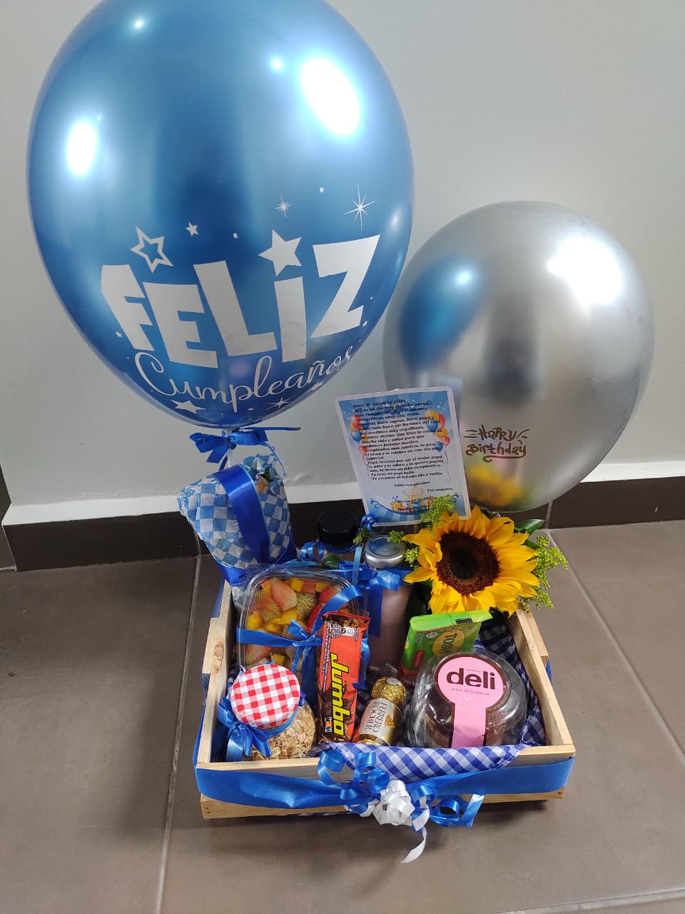 Caja de regalo de cumpleaños con globos, frutas frescas, chocolates, torta, galletas y un vibrante girasol, ideal para celebrar un día especial y lleno de alegría.