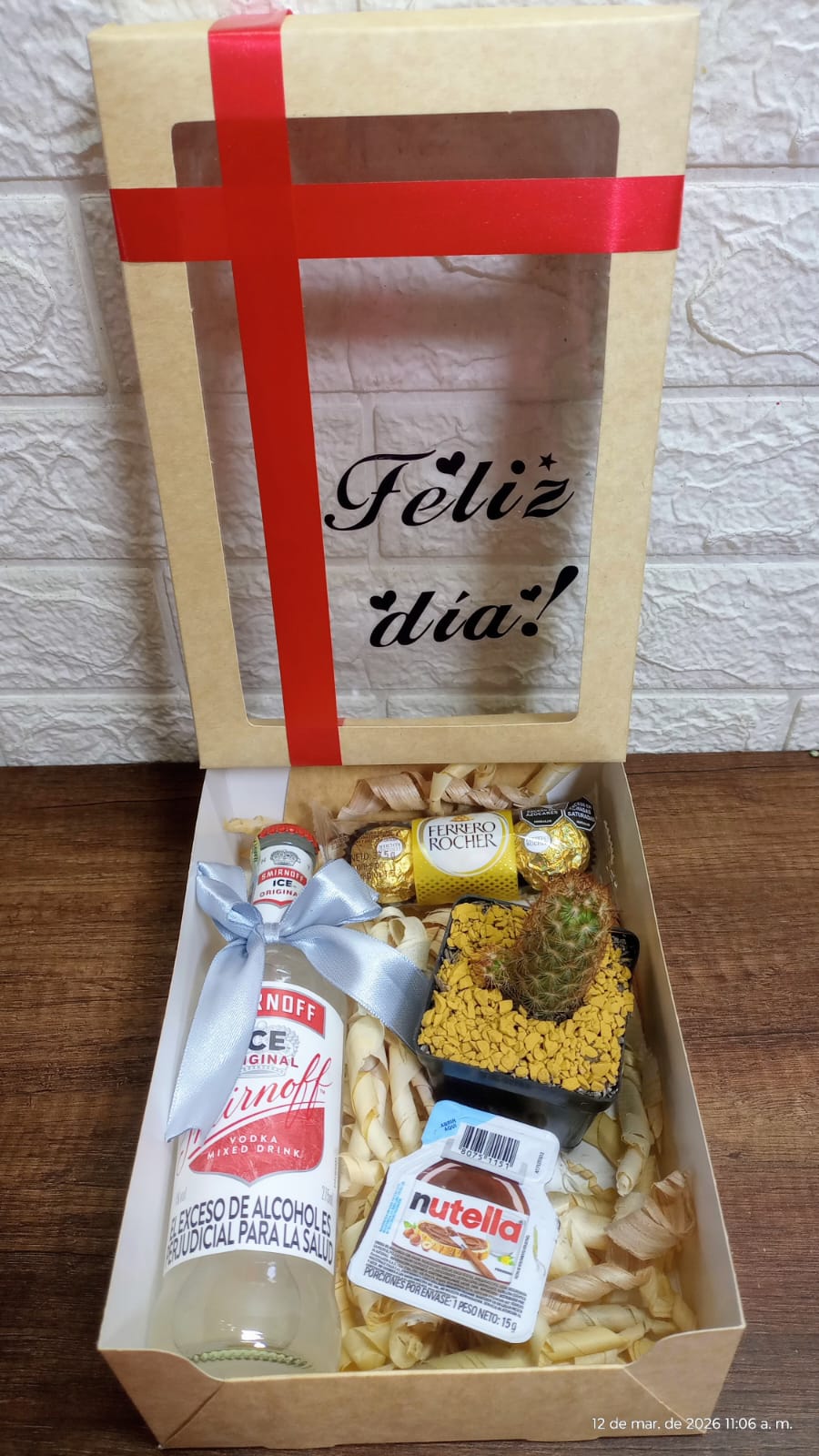 Caja de regalo especial para celebrar cualquier día, incluye una bebida Smirnoff Ice, chocolates Ferrero Rocher, Nutella y un mini cactus para un detalle único y completo.
