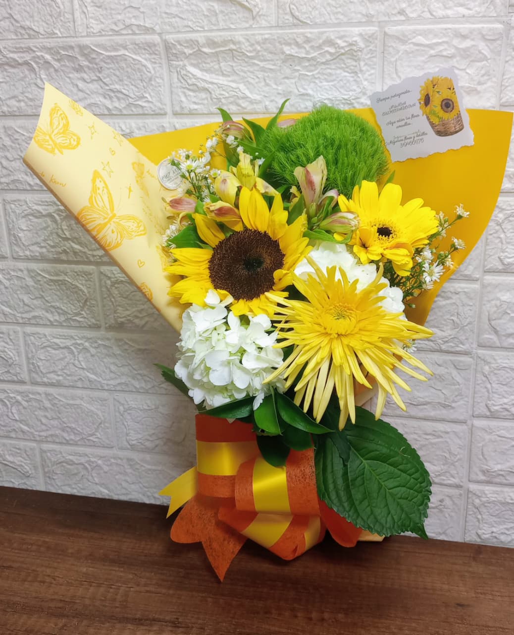 Hermoso ramo de flores vibrante con girasoles, gerberas amarillas y hortensias blancas, envuelto en papel decorado con mariposas y un lazo colorido, ideal para cualquier ocasión.