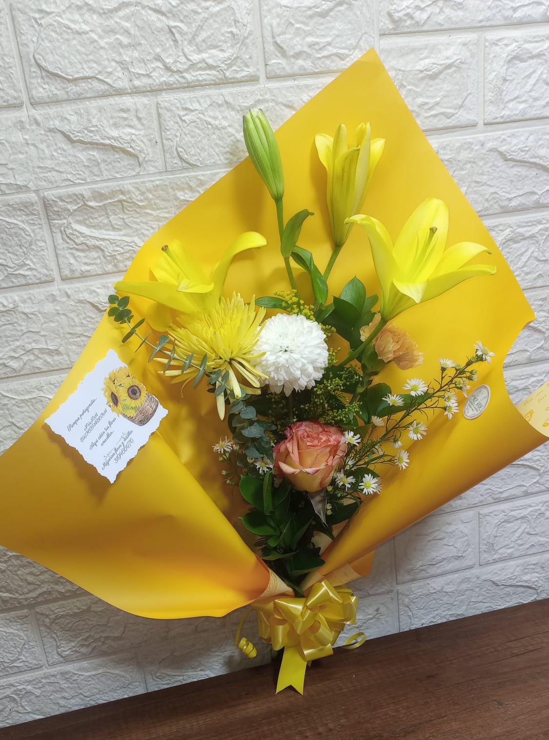 Un vibrante ramo floral con lirios amarillos, crisantemos y una rosa salmón, envuelto en papel amarillo brillante, ideal para regalar y llevar alegría.