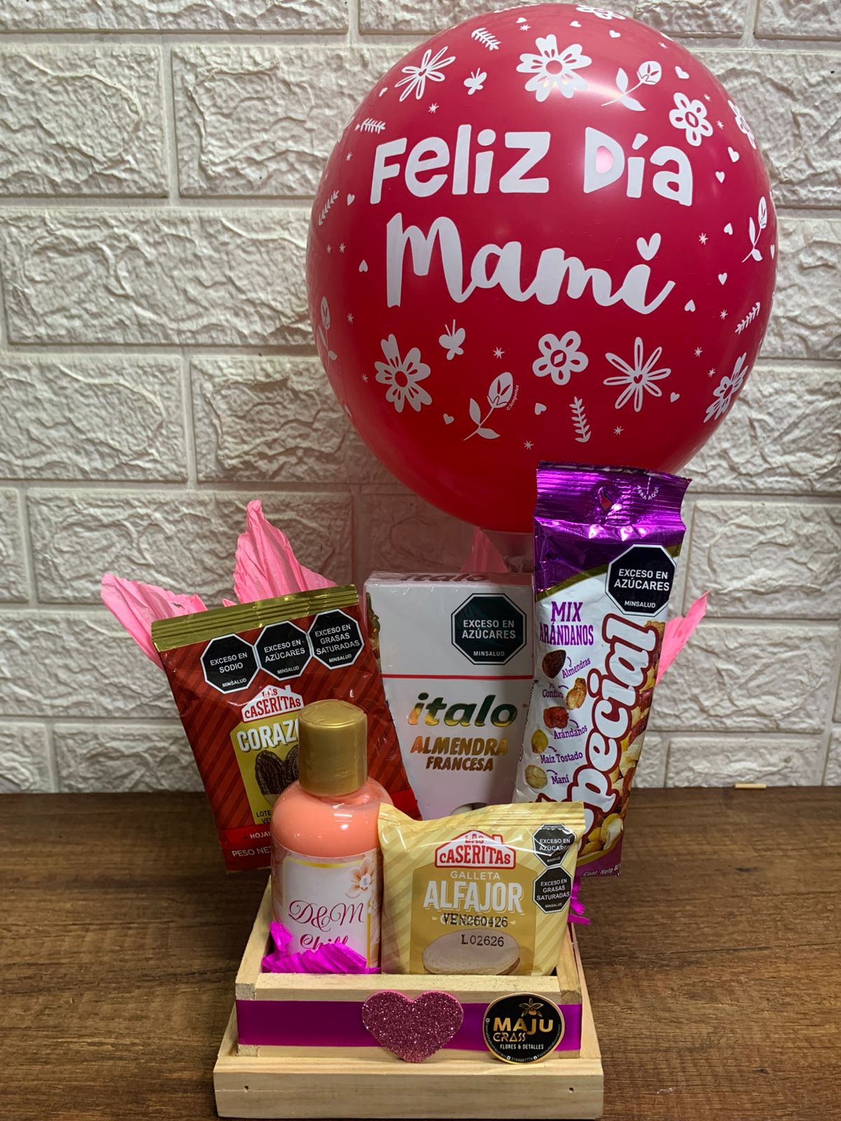 Cesta de regalo especial para Mamá con un globo 'Feliz Día Mami', dulces variados como alfajores, galletas corazón, almendras francesas y mix de arándanos, además de una crema de manos viajera. Perfecta para celebrar el Día de la Madre.