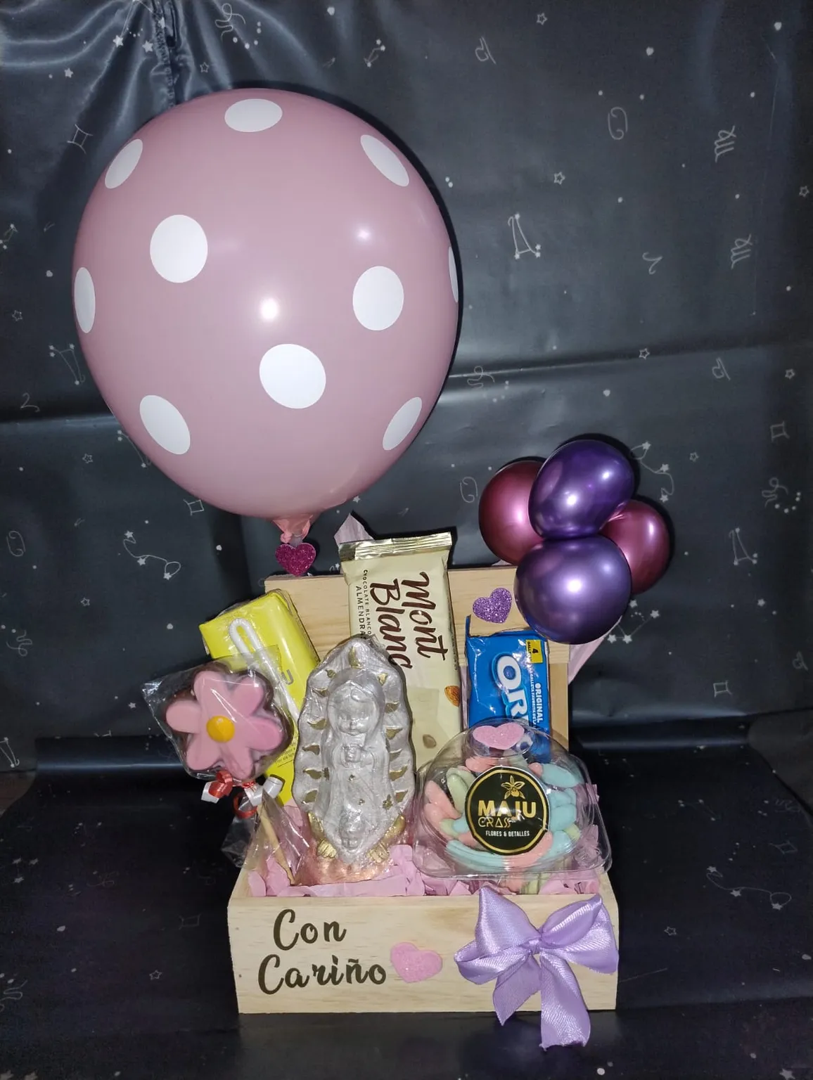 Caja de regalo que incluye dulces variados, chocolates, globos y una figura decorativa, perfecta para expresar cariño en cualquier ocasión especial.
