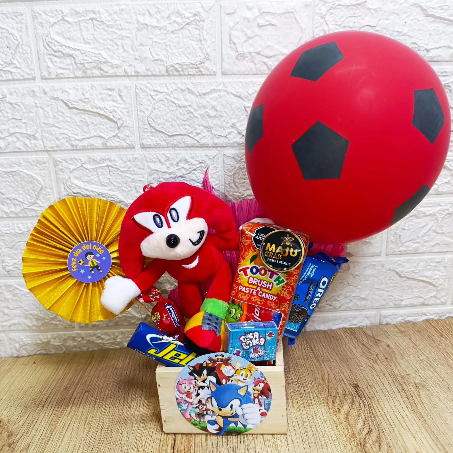 Caja de regalo vibrante con peluche de Knuckles, dulces variados, globo de fútbol y temática de Sonic, ideal para celebrar el Día del Niño con alegría y sabor.