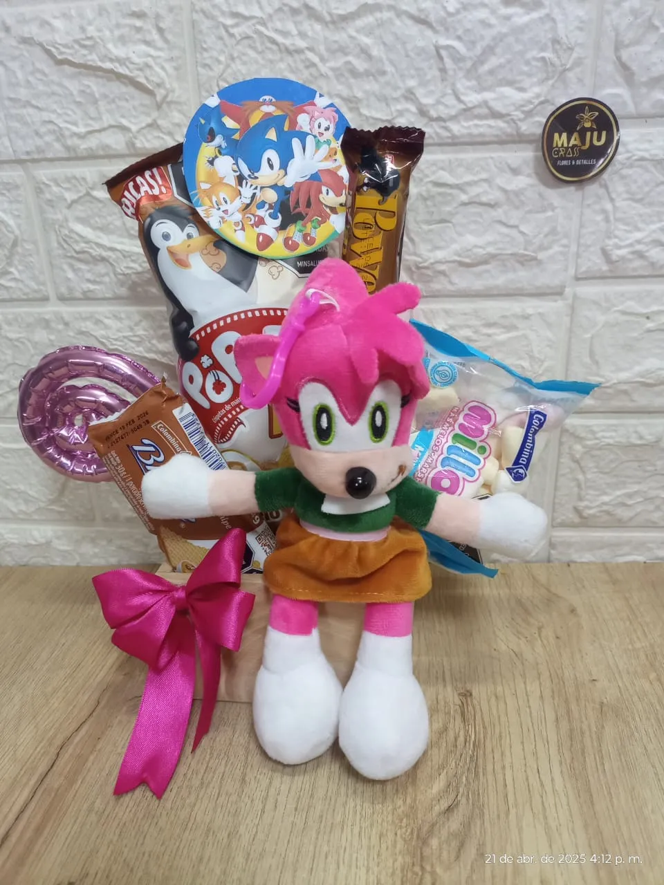 Set de regalo con un tierno peluche de Amy Rose de Sonic, acompañado de una deliciosa variedad de dulces y snacks, ideal para sorprender a cualquier fan del famoso erizo.