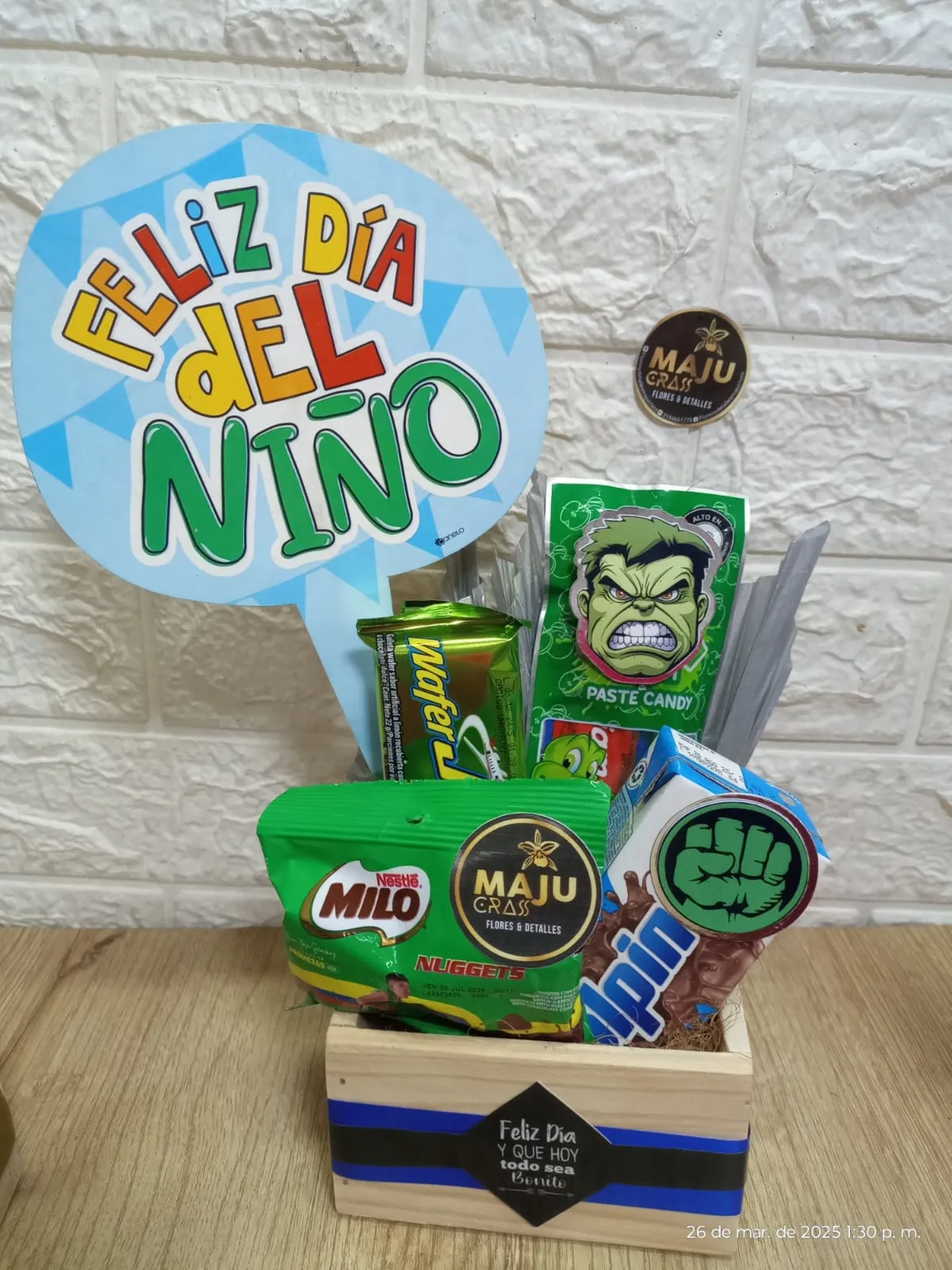 Caja de regalo especial para el Día del Niño, llena de deliciosos dulces y snacks temáticos de superhéroes como Hulk, perfecta para sorprender a los más pequeños con un detalle divertido y sabroso.