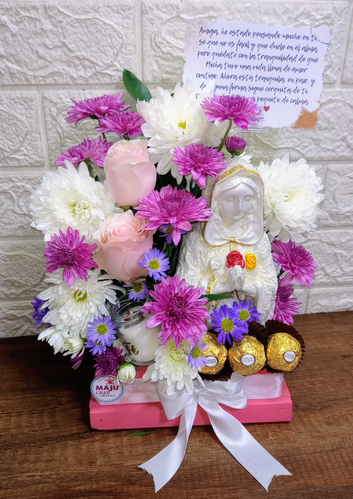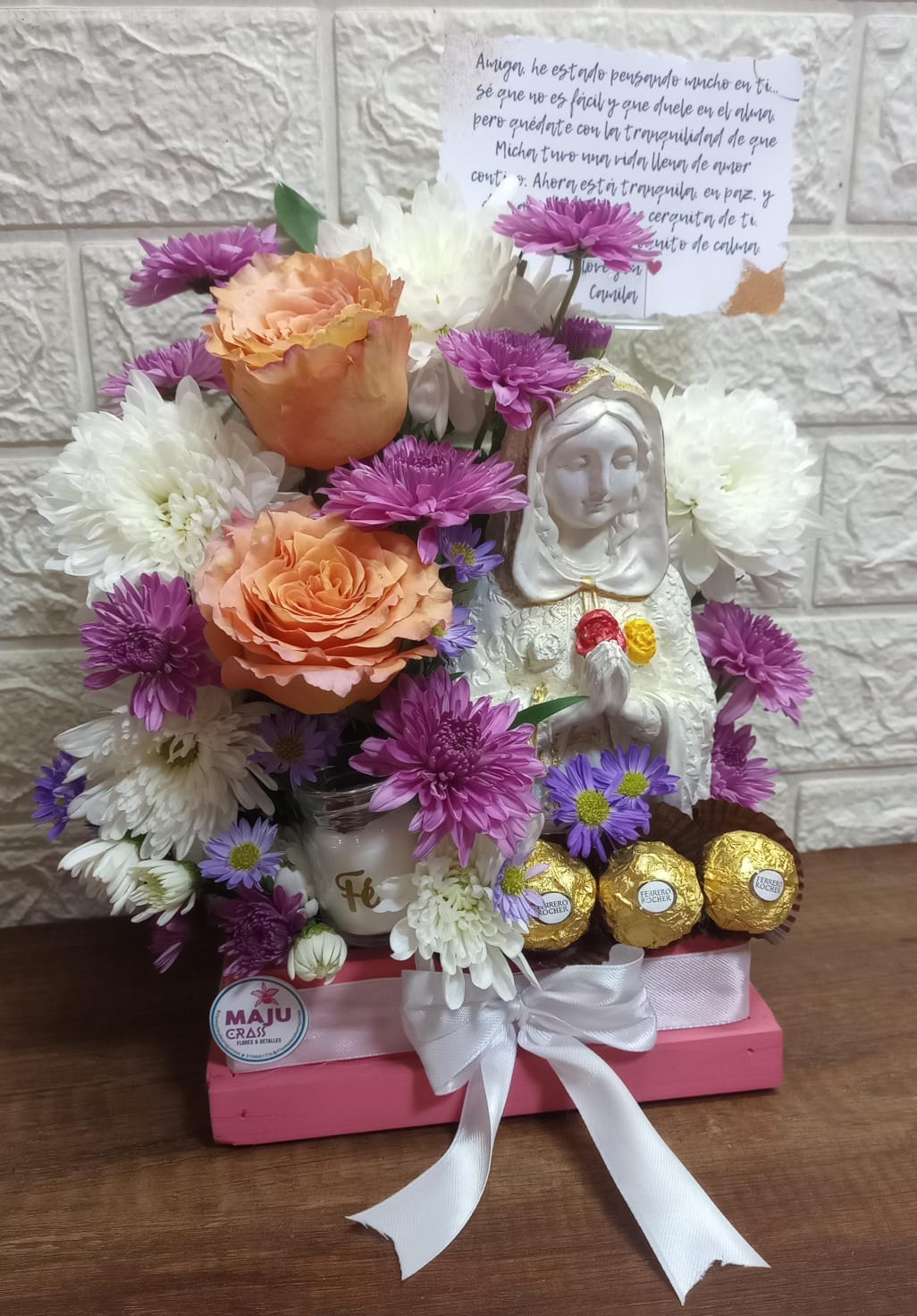 Hermoso arreglo floral en tonos suaves con rosas, crisantemos y una figura de la Virgen María. Incluye chocolates Ferrero Rocher, una vela con 'Fe' y tarjeta con mensaje de consuelo. Ideal para expresar apoyo.