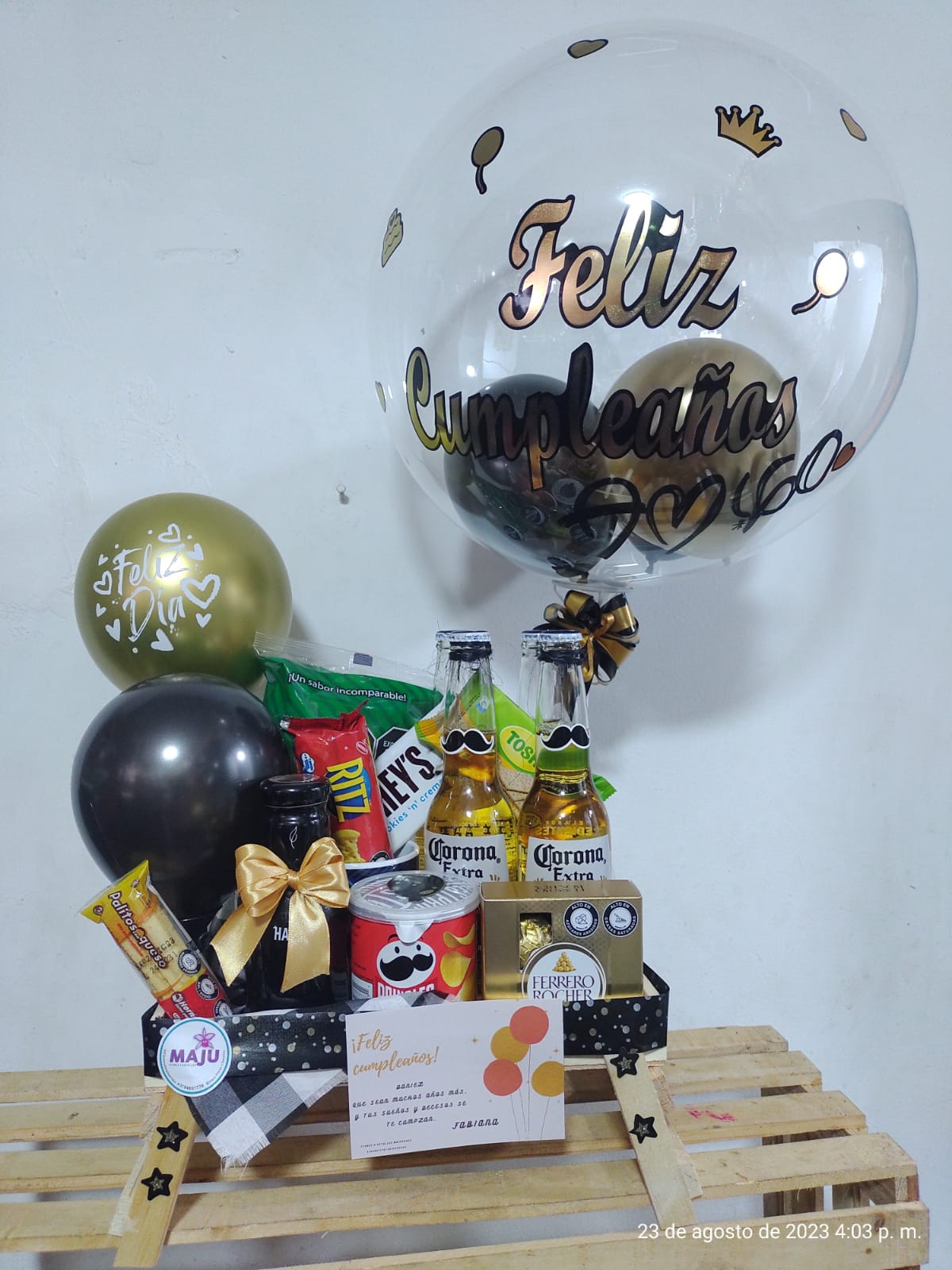 Exclusiva canasta de regalo de cumpleaños con globos, 4 Cervezas Corona, chocolates Ferrero Rocher y una variedad de snacks Pringles, RITZ, papas grandes chocolatina Hersey. Perfecta para celebrar con estilo y alegría en su día especial.