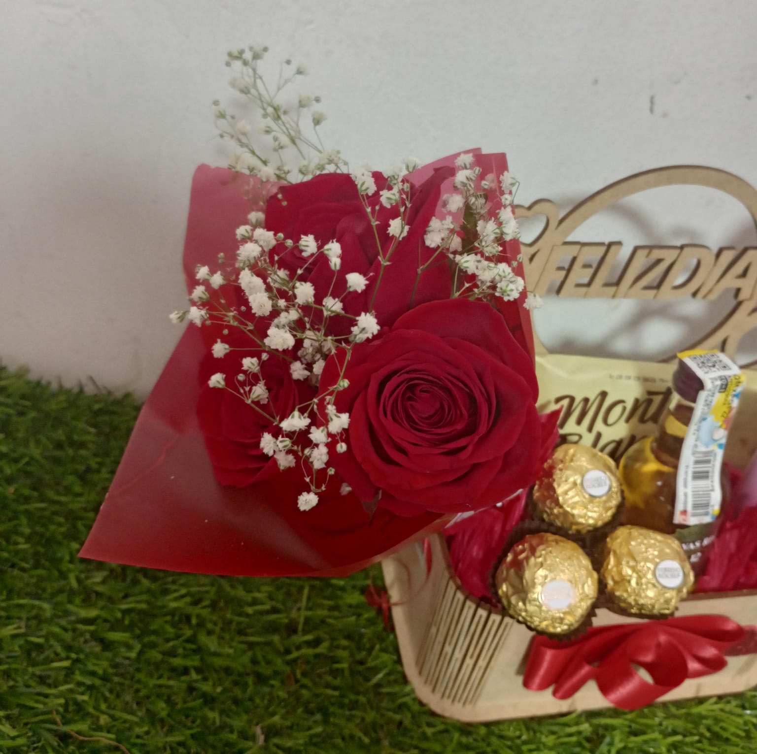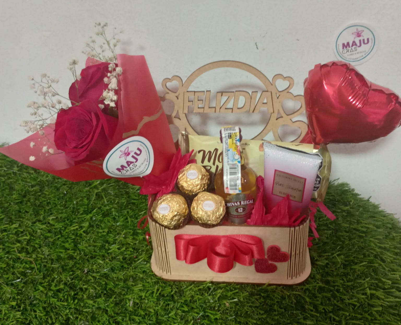 Caja de regalo 'Feliz Día' con un hermoso ramo de rosas rojas, chocolates Ferrero Rocher, whisky Chivas Regal y loción Victoria's Secret. El detalle perfecto para celebrar.