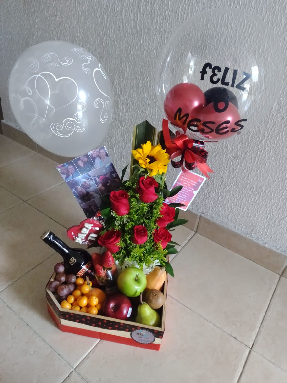 Celebra un aniversario especial con esta cesta de regalo que incluye rosas, un girasol, globo "Feliz 6 Meses", frutas frescas variadas, Baileys y chocolates, ideal para sorprender y deleitar.