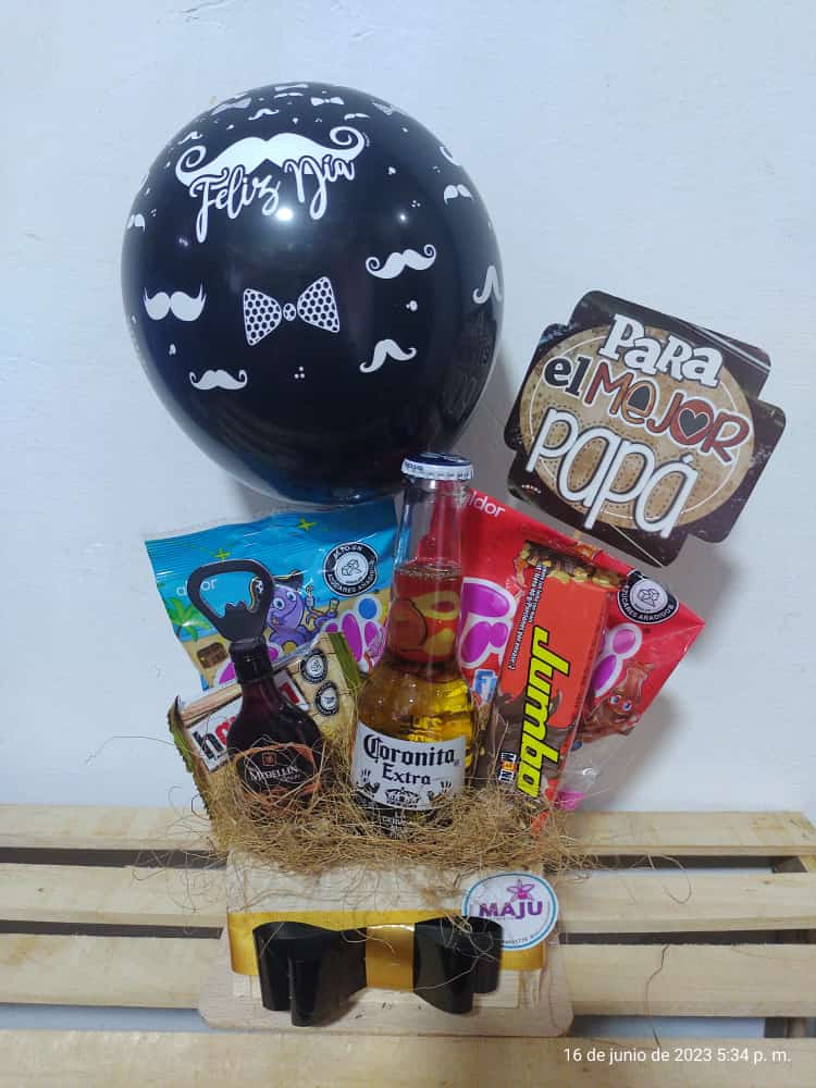 Regalo ideal para el Día del Padre con cerveza Coronita, gomitas 2,galletas de avellana, un destapador con iman y un globo festivo. Perfecta para celebrar al mejor papá con un detalle memorable y completo.