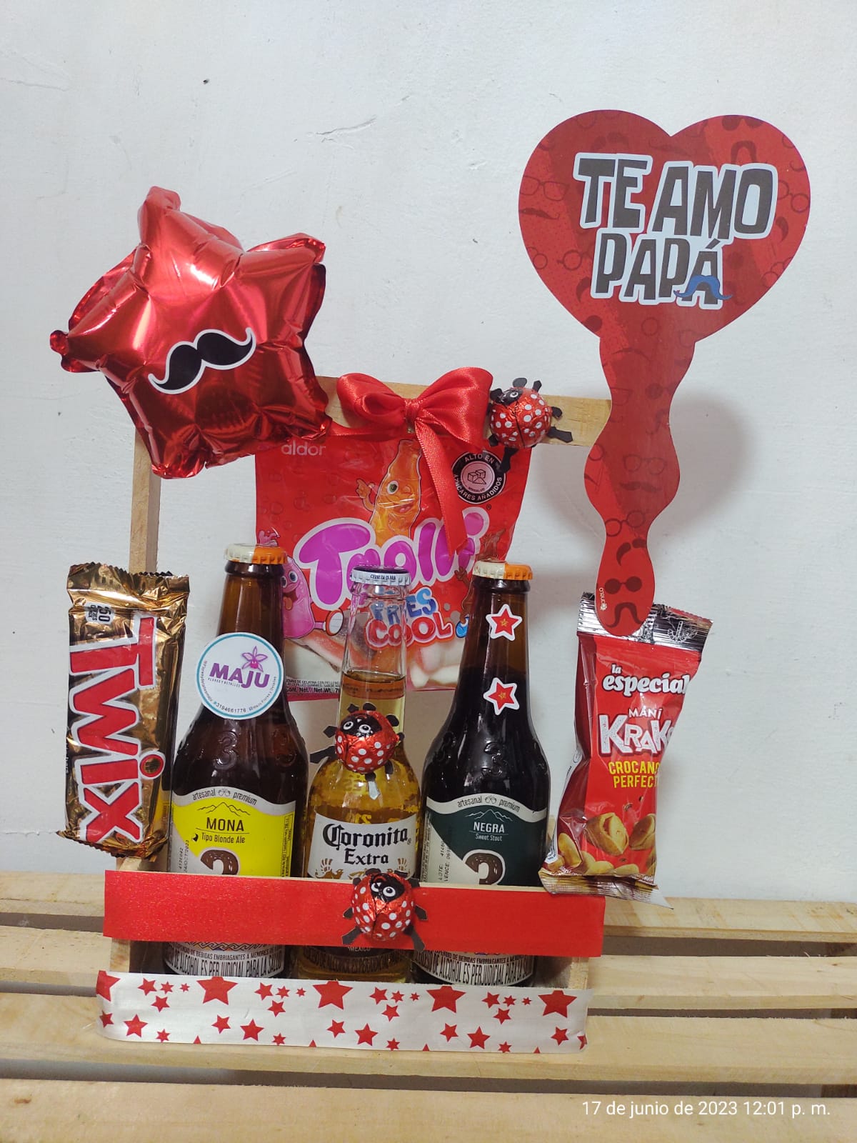 Celebra a papá con esta caja de regalo que incluye tres cervezas artesanales variadas (chocolatina americana, Coronita Extra, artesanal, mani), y decoraciones festivas. ¡Perfecto para el Día del Padre!