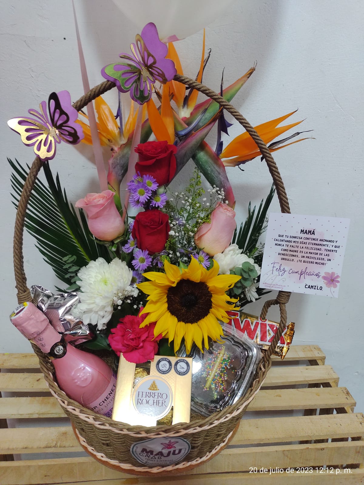 Hermosa cesta de regalo con arreglo floral vibrante (girasoles, rosas, aves del paraíso), vino espumoso rosado J.P. Chenet, chocolates Ferrero Rocher, barra americana y postre o torta. Ideal para toda ocasión. Incluye 2 globos en helio con mensaje según celebracion, y tarjeta dedicatoria.
