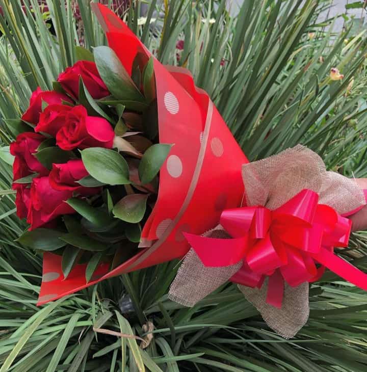 Elegante ramo de 12 rosas rojas frescas, envuelto en papel decorado y atado con un lazo doble, ideal para expresar amor y celebrar ocasiones especiales. Incluye tarjeta dedicatoria
