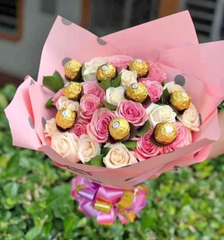 Exquisito ramo de 25 rosas frescas en tonos rosa y blanco, complementado con deliciosos chocolates Ferrero Rocher y envuelto en papel rosa, ideal para cualquier ocasión especial.