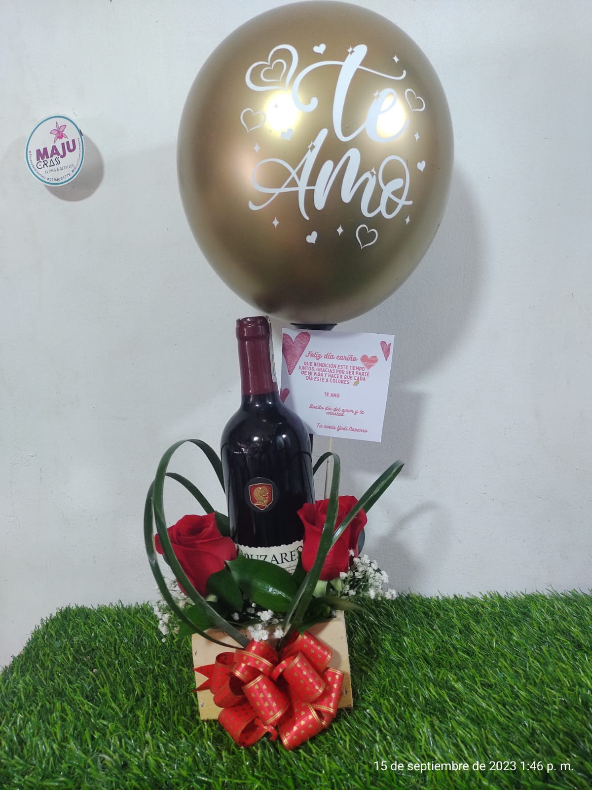 Hermoso arreglo romántico con globo "mensaje segun celebracion", botella de vino tinto y frescas rosas rojas en una caja decorada. Ideal para celebrar el amor en cualquier ocasión especial.