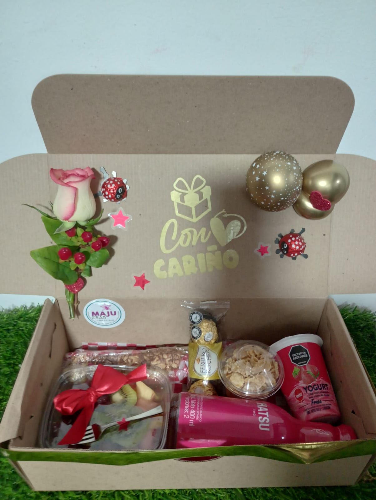 Caja de regalo 'Con Cariño' que incluye un desayuno o merienda especial con mix de frutas, chocolates Ferrero, yogurt, cereal, té Hatsu y una rosa natural. Ideal para sorprender.