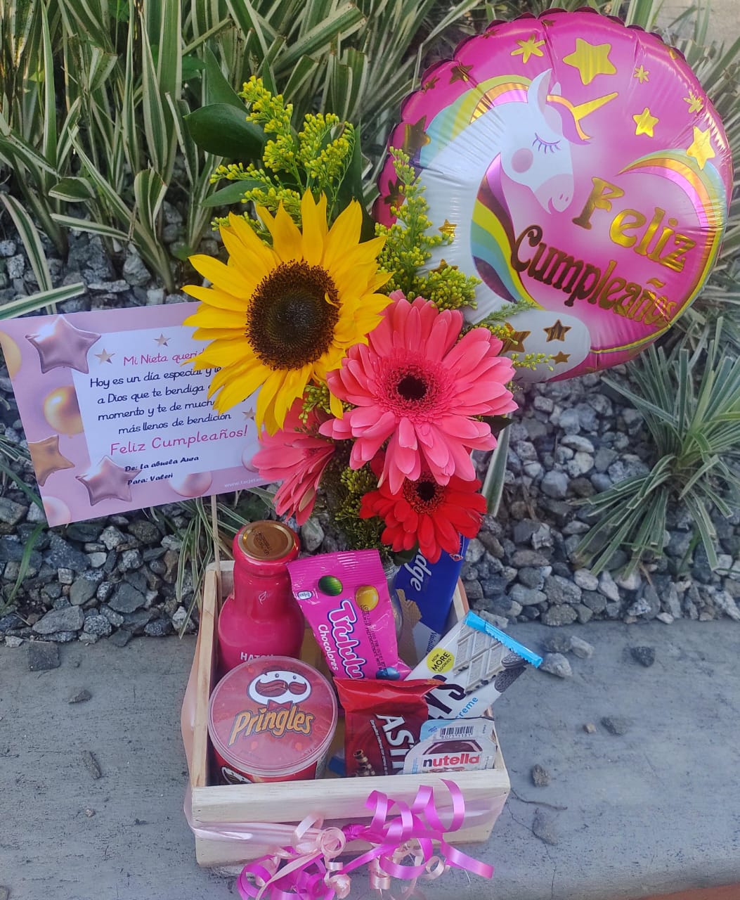 Celebra con esta encantadora cesta , ideal para sorprender. Incluye un hermoso arreglo floral, un globo con mensaje según celebración y una selección Pringles, chocolates, Nutella, te hatsu, Hersey, taco grande de galletas, gomitas trululu ).. El regalo perfecto para una ser querido.